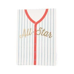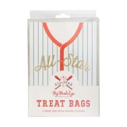 Batter up and hit it out of the park with these All-Star Baseball Jersey Treat Bags! These paper favor bags resemble pinstriped baseball jerseys and feature a shining gold foil “all-star” headline across the chest. The eight sheets of gold foil number stickers will allow you to personalize each jersey and identify its owners. Whether filling them with peanuts, crackerjacks, or other baseball party favors, these bags will surely be a home run hit with your little sluggers. Hand them out on your little rookie of the year’s baseball birthday, or distribute them to the entire Little League baseball team after their World Series game!