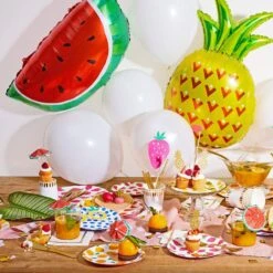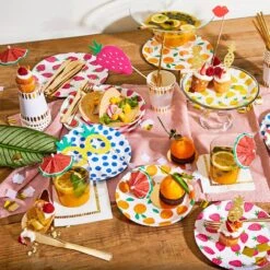 Add a colorful and sweet touch to your Tutti Frutti birthday party with these Fruit Punch Lunch Plates. Featuring a bright mix of strawberries, blueberries, pineapples, watermelons, and oranges on a white background with a solid color backside to match each fruit on the front side. Freshen up your summer soiree or baby shower with these fruity cute paper plates.