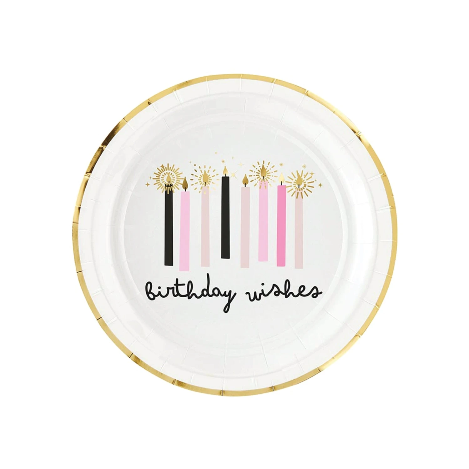 Indulge in sweet celebrations with our Birthday Wishes Dessert Plates! These whimsy paper plates feature a gold foil trim, pink and black candles with gold foil flames and sparks, and a black “birthday wishes” cursive headline in the center against a white background. Perfect for a girl birthday party of any age, these plates plates bring a playful touch to your tablescape. Use them to serve up cake, snacks, or a festive meal, and pair them with pink decorations for a beautifully coordinated birthday setup!