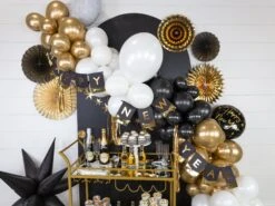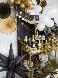 Add some glitz to your new year celebration with this Black & Gold Happy New Year Fringe Banner. This elegant banner is made with black paper and gold foil letters, and fringe. Pair this banner with party fan decorations to create a fun and memorable backdrop for your new year’s party.  This banner goes perfectly with our other New Year’s Eve party supplies!