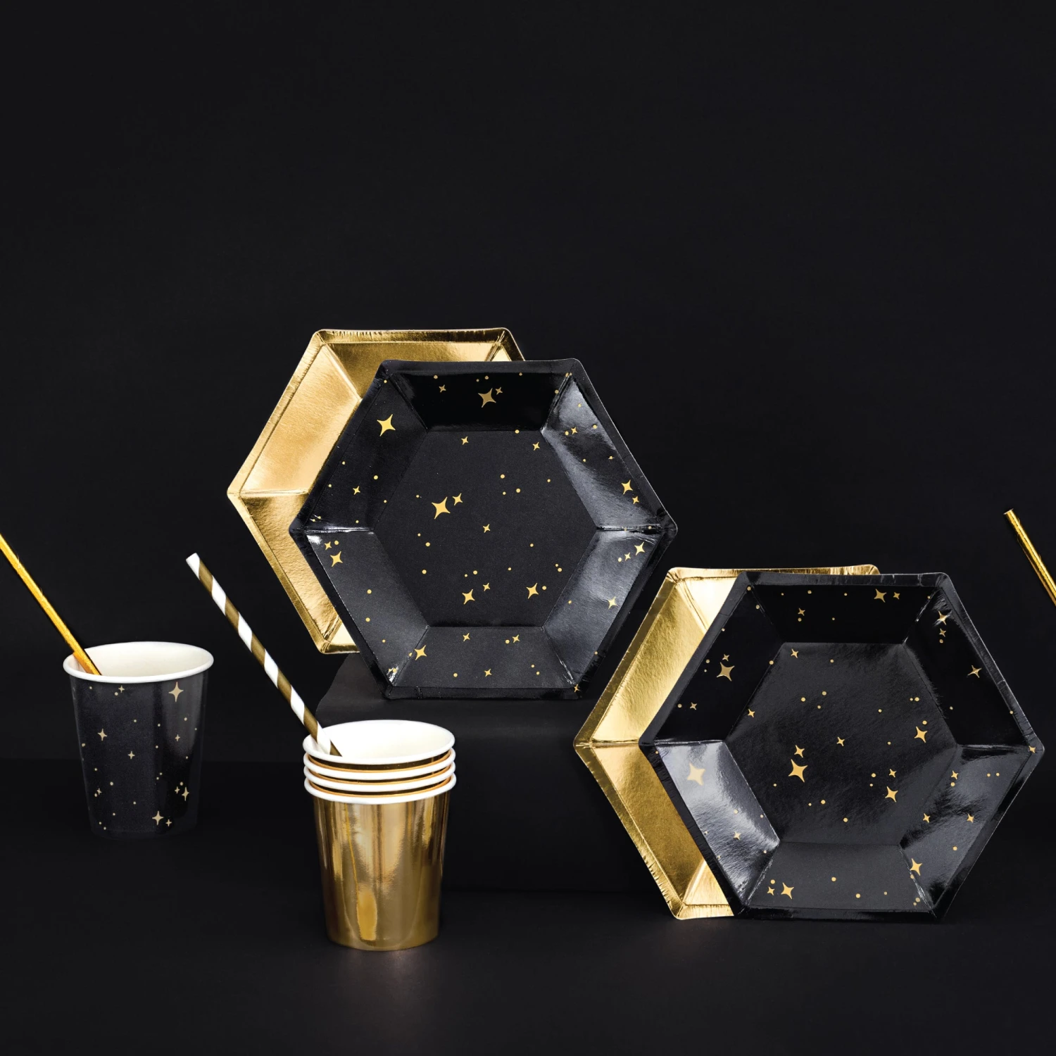 Celebrate in style with these elegant Black & Gold Star Dessert Plates that are perfect for a New Year’s celebration, milestone birthday, anniversary, or any other classy celebration.