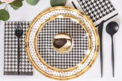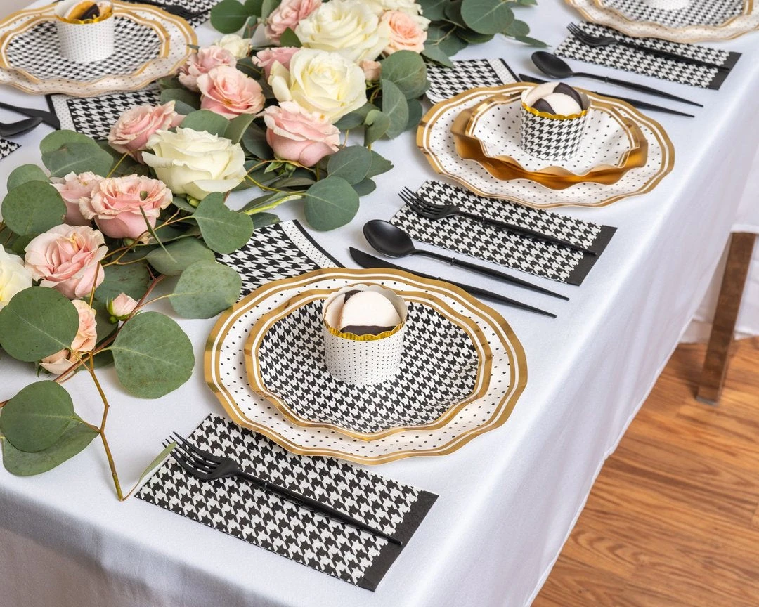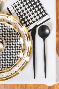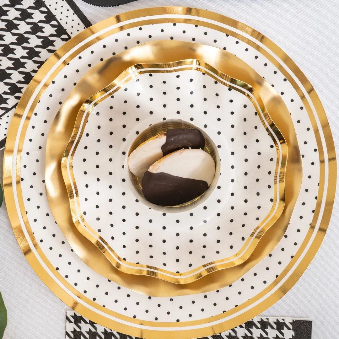 Add an elegant touch to your tablescape with Blanc & Noir Wavy Dinner Plates. These large paper plates feature a ruffled metallic gold rim with black polka dots on a solid white plate. Each plate has a ruffled edge that is sure to add a touch of elegance to any baby shower or holiday party. Set a party plate at each place setting so guests can enjoy a delicious meal. Use these plates to complete the tableware for your Easter party, baby shower, or other special occasions!
