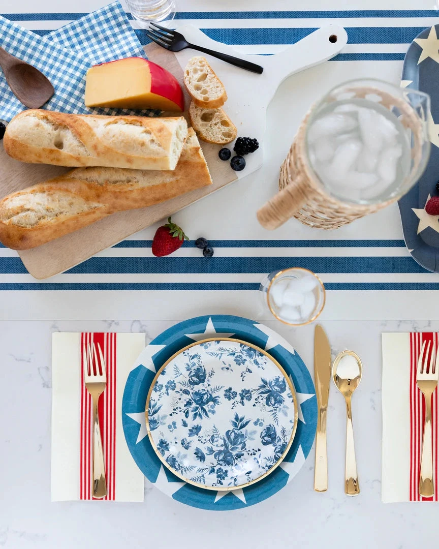Create the perfect classic coastal tablescape with this Blue & Cream Striped Paper Table Runner. With a traditional blue and cream twill design, this table runner is the perfect base layer for summertime picnics, farmhouse brunches, or seaside soirees.