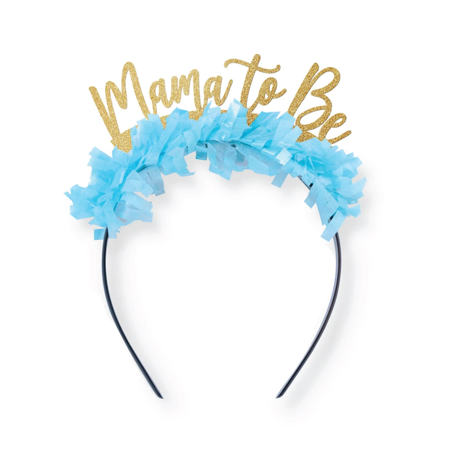 Gift this Blue Fringe Mama to Be Headband to the mother-to-be so she can wear it loud and proud at the baby shower! This fun hair accessory reads “Mama to Be” in glittery gold letters across the top with a black plastic headband and light blue tissue fringe. This trendy mom-to-be party crown makes a great photo prop for their gender reveal party. Accessorize your baby shower or gender reveal outfit with this celebratory headband!