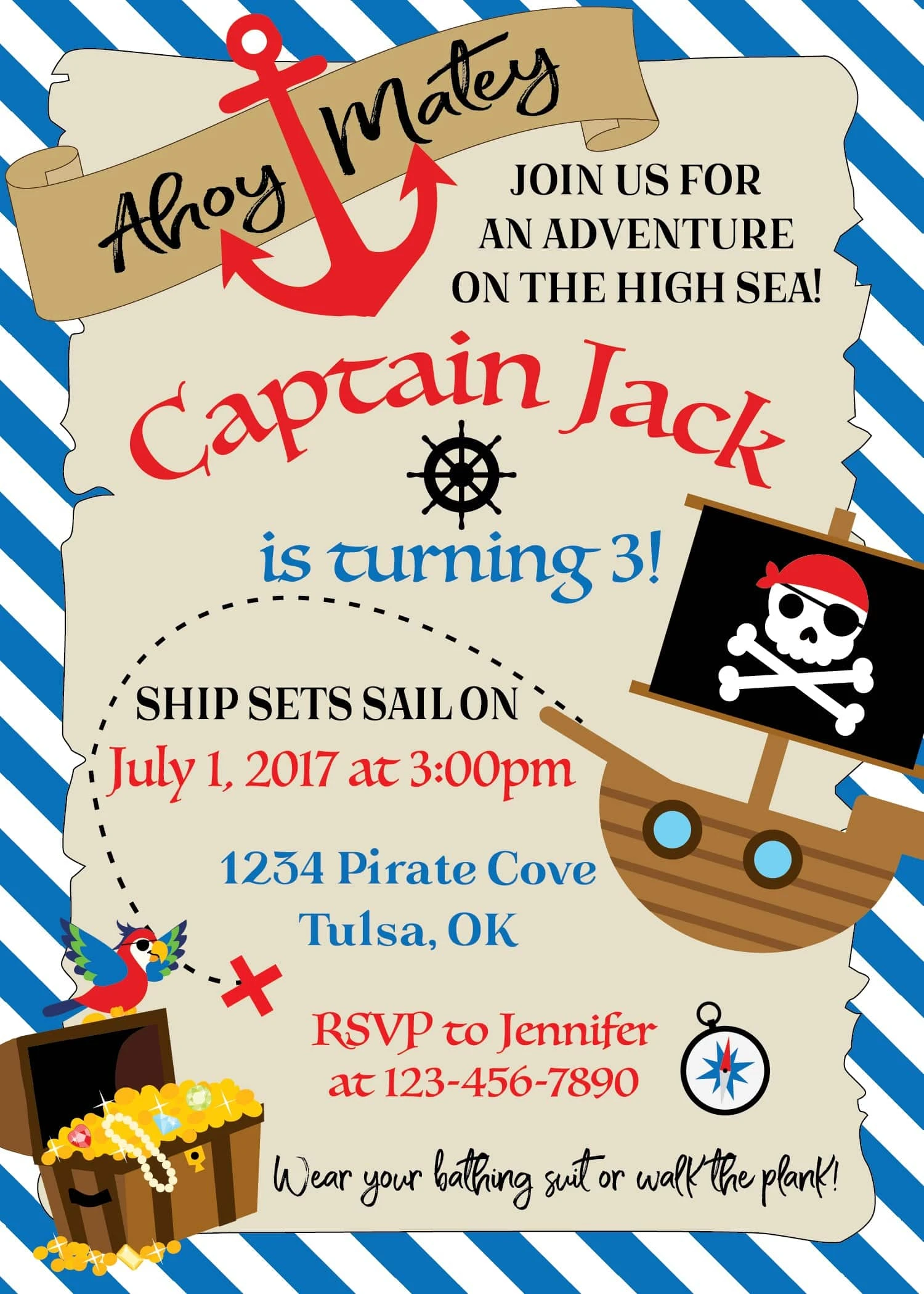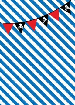 Ahoy, Matey! Invite the crew out to sea with this personalized Pirate Birthday Party Invitation in blue stripes! This two-sided invitation features a pirate ship, anchor, and buried treasure which makes it perfect for your little captain’s pirate-themed birthday party. The backside has blue stripes and a red and black skull banner. This listing is for a personalized digital invitation that is print-ready. It’s easy to customize your message. If you would like to request different colors, please contact us for a custom order. With our fast production schedule, we will have these in no time!