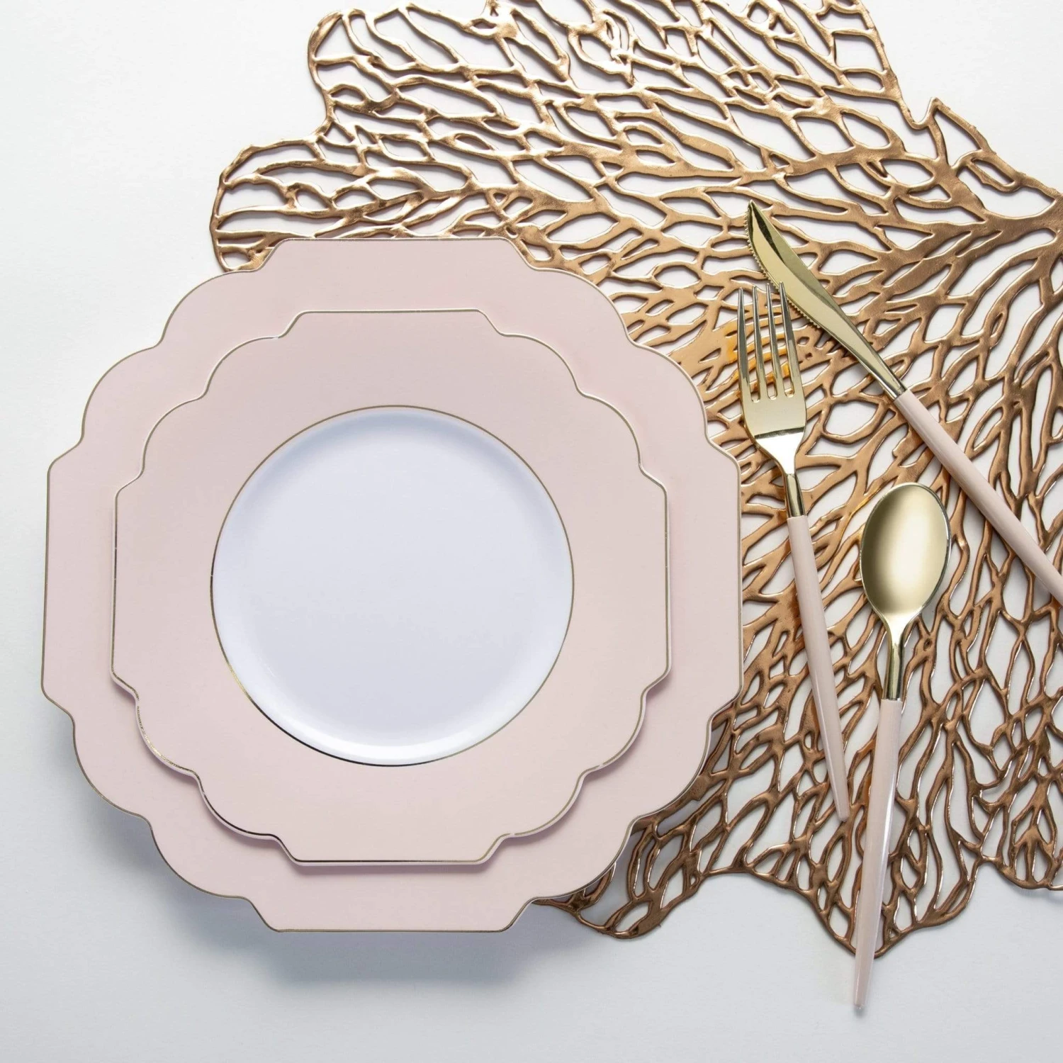 Plan a lovely tea party with your loved ones with these Blush Pink Scalloped Plastic Dinner Plates. These sizeable heavy-duty plastic plates have a white center outlined in gold, a chic light pink scalloped edge, and metallic gold trim. With a beautiful glossy finish, this premium plastic tableware looks like fine china and suits any sophisticated occasion. Set one down at each place setting or stack them up on your buffet table so guests can help themselves at your bridal shower, baby shower, or child’s first birthday party. In addition, their large size makes them great for various occasions, including dinner parties, birthdays, weddings, and holiday parties like Mother’s Day and Easter.