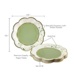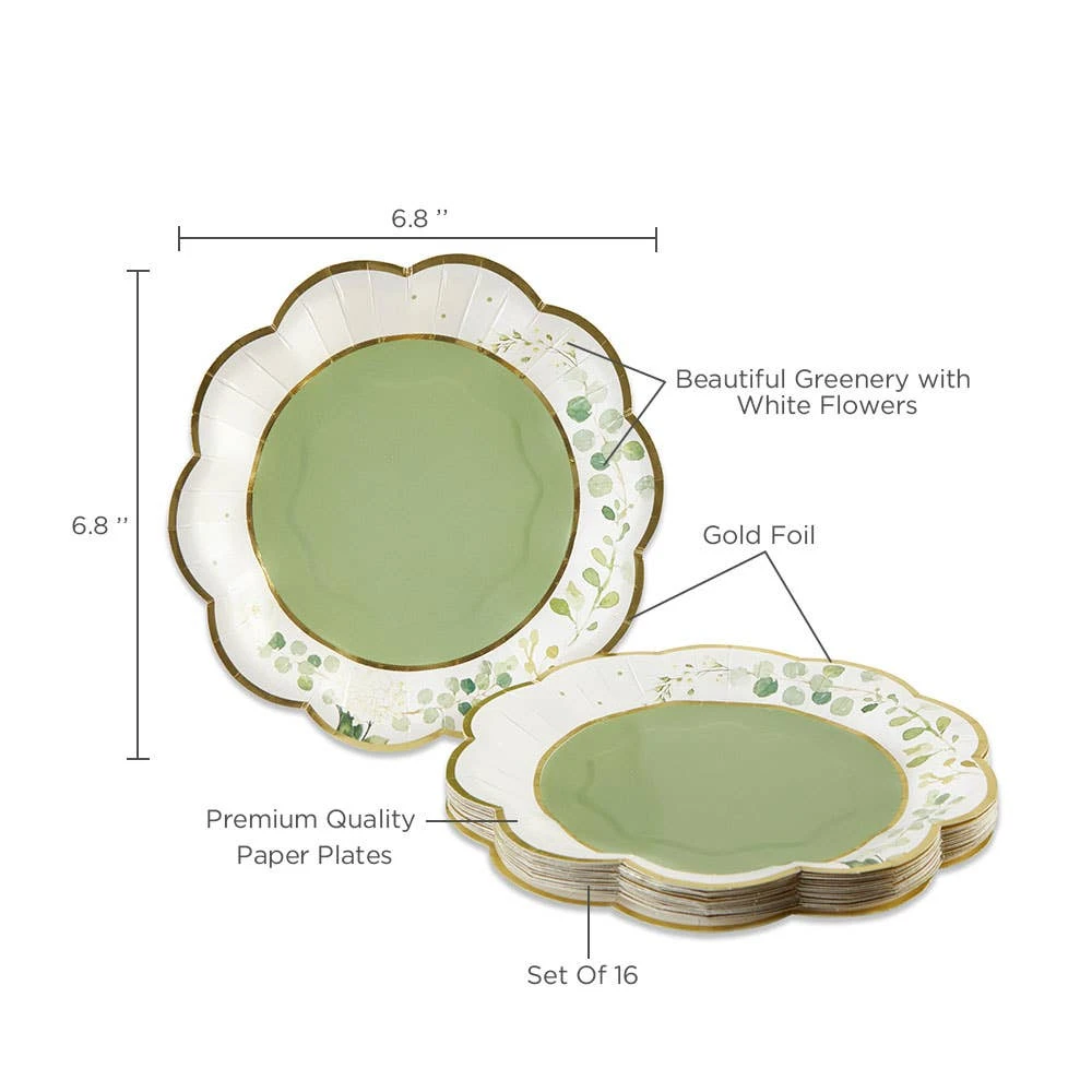 Serve snacks or cake at your nature-inspired bridal shower with these Botanical Garden Dessert Plates. These elegant scalloped paper plates feature delicate greenery and cream flowers with a gold foil trim and sage green in the center. Use these small plates at your bridal shower or baby shower for an elegant and natural feel.