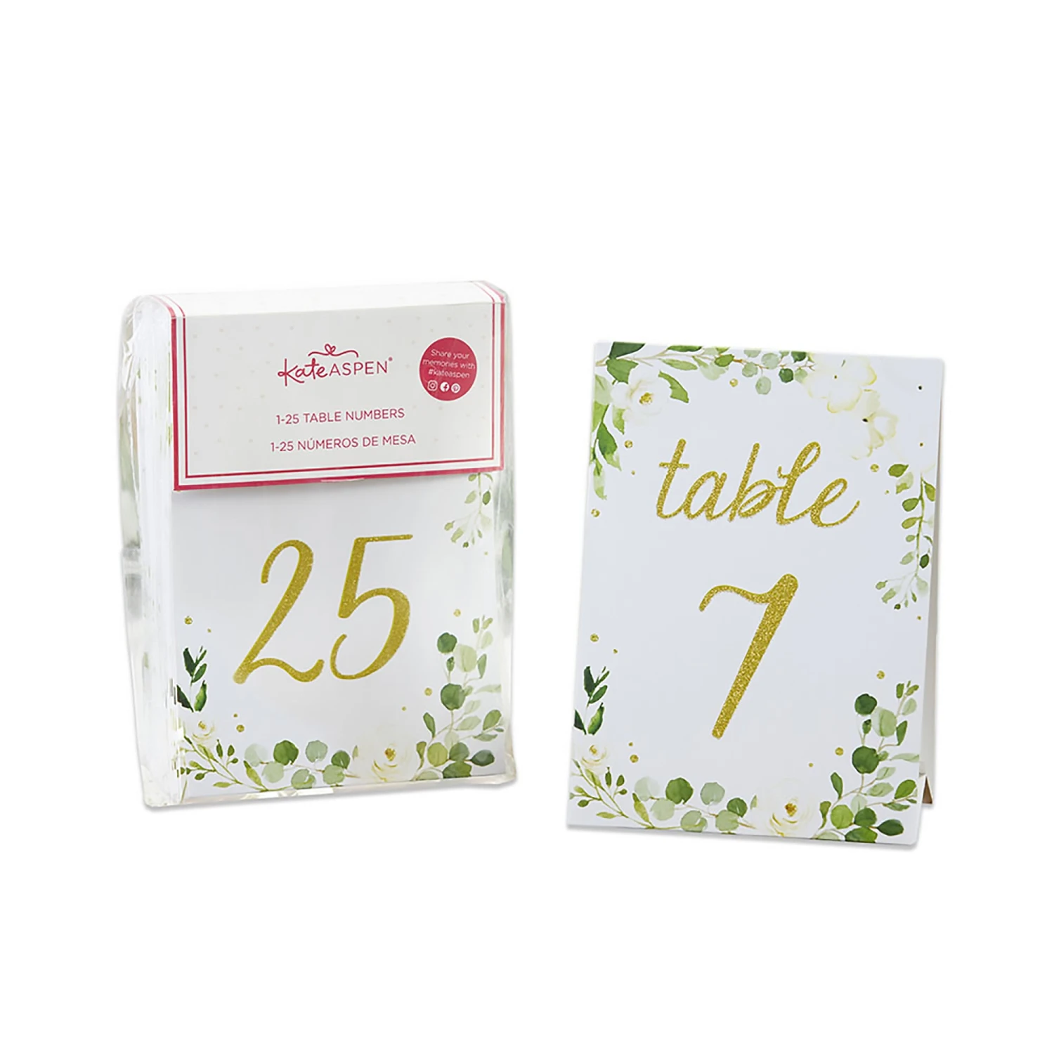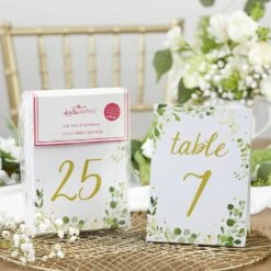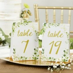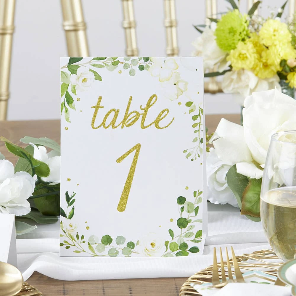 Guests can easily find their seats at your wedding reception with these Botanical Garden Wedding Table Numbers. The table numbers are made from high-quality cardstock and feature an arrangement of greenery and white flowers along the outer edges, with gold glitter lettering and numbers. This set includes the numbers 1-25. Table numbers are essential for big parties, but they are also great to assign brunch tables or have stations for children to decorate cookies at your Easter celebration with each step being assigned a number.