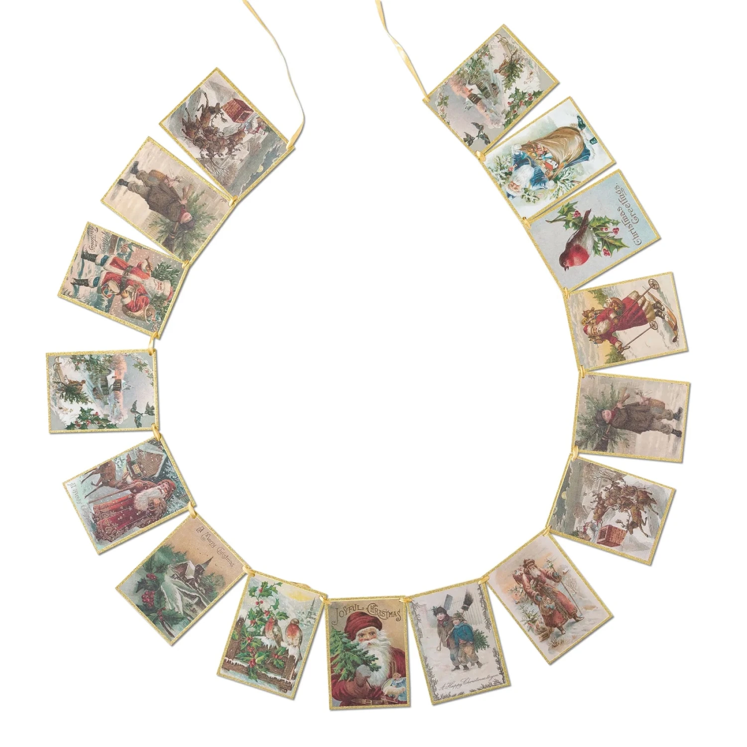 Give your home a traditional holiday look with this Botanical Vintage Christmas Banner. Featuring 16 cardstock vintage Christmas scenes of a winter wonderland village with Santa, this banner is a festive focal point for your Christmas mantel decoration. With sparkling glitter accents around the card’s edges and pre-strung with twinkly tinsel ribbon, this Holiday banner creates a merry backdrop for all your Christmas gatherings!
