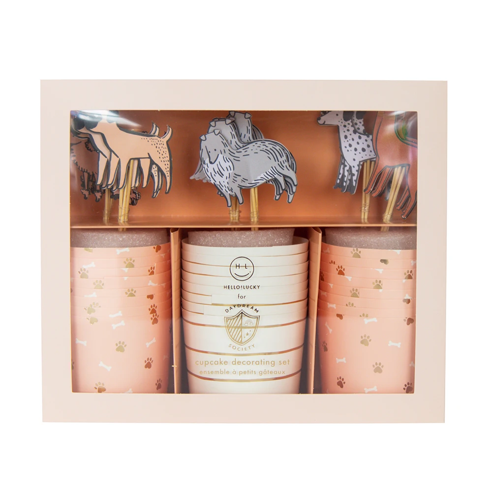Celebrate your little dog lover’s birthday with this Bow Wow Dog Cupcake Kit. Featuring a warm neutral color palette and gold foil elements, this puppy dog decorating set will definitely make your cupcakes best in show! Use these cups to make homemade cupcakes. Just fill each cup halfway with your favorite cake mix, place on a baking sheet and bake. These treat cups are also good to fill with candies, ice cream, fruit, snacks, and dips.