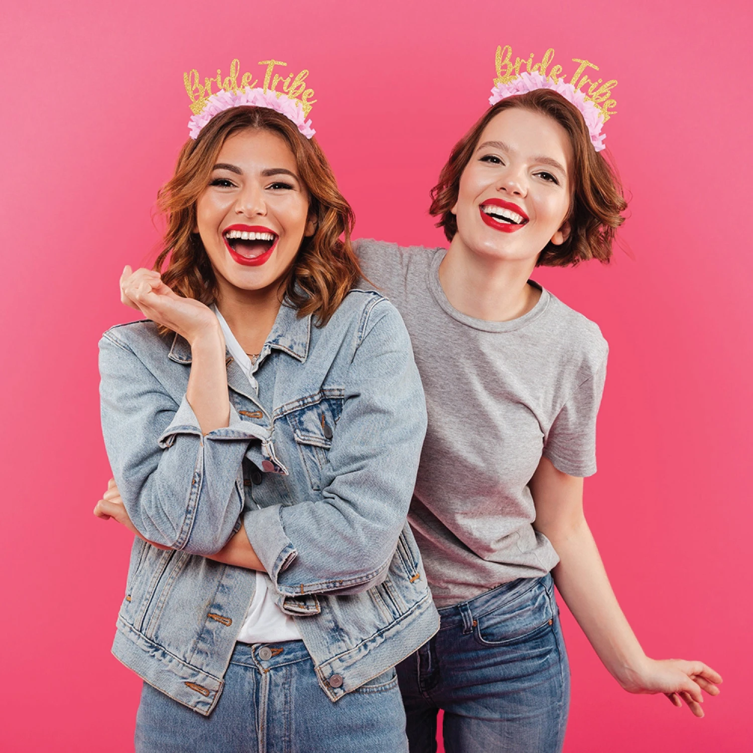 Celebrate the bride-to-be in style with a Bride Tribe Headband. This fun hair accessory reads “Bride Tribe” in glittery rose gold letters across the top and a light pink tissue fringe on a black plastic headband. This trendy party crown makes a great photo prop and party favor for your bridal shower. Gift this cute hair accessory to a bridesmaid so she celebrates the bride-to-be at a bachelorette party or a bridal shower gathering!