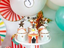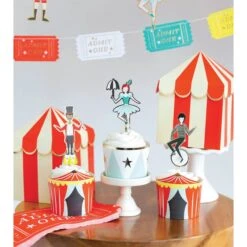 Step up your dessert display by creating a charming carnival scene in a snap with this Carnival Cupcake Decorating Kit. This cupcake baking kit includes 24 baking cups in two designs and 12 cupcake toppers featuring a whimsical cast of carnival characters with gold foil accents. Use this decorating kit to ensure your cupcake display is ready to take center stage at your child’s carnival birthday party. Pair this circus decoration with other carnival party supplies for an extravagant celebration.