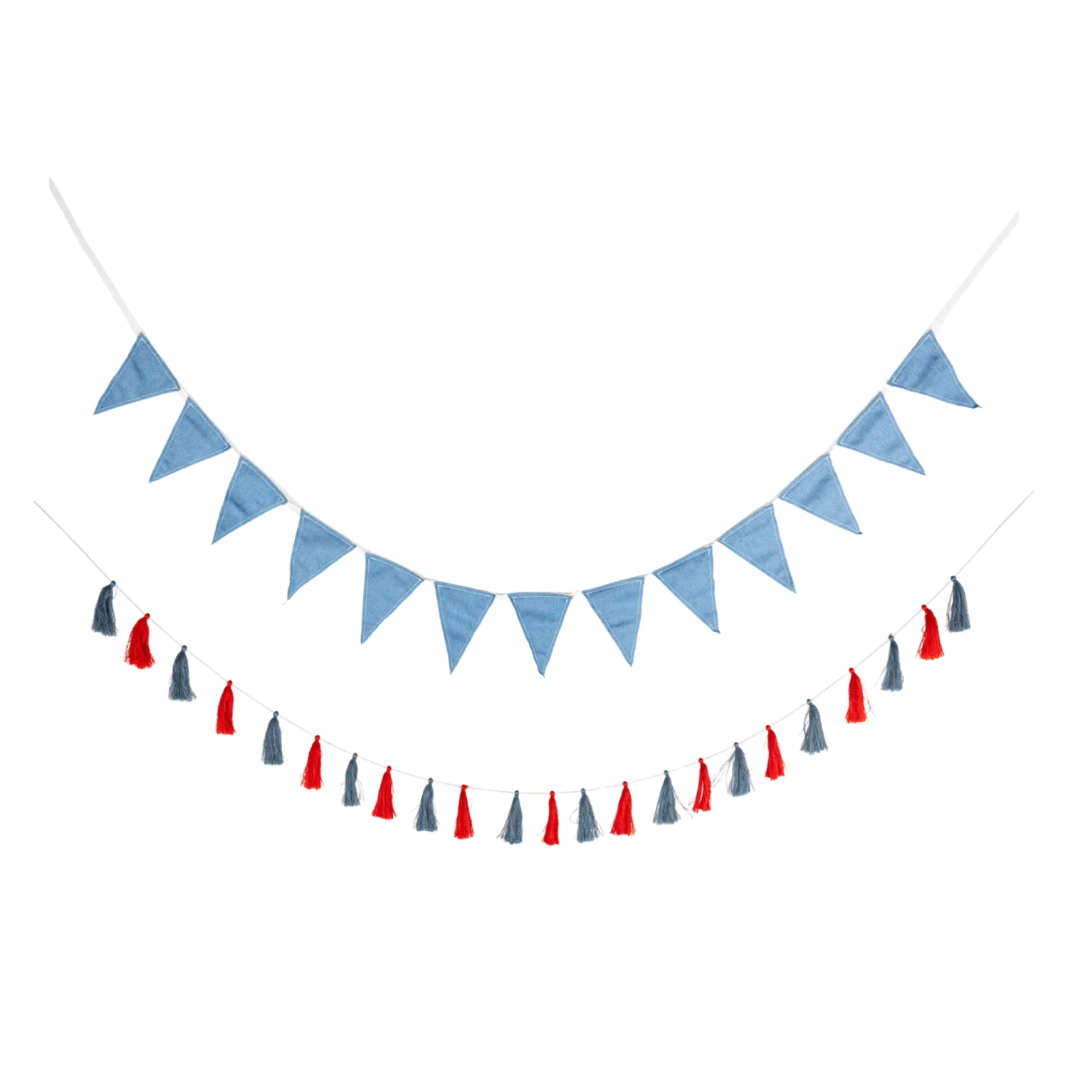 Add a star-spangled charm to your patriotic party space with this Chambray Pennant & Patriotic Tassel Garland Set! This set includes two 5-foot garlands—one featuring red and blue tassels, and the other showcasing a classic chambray pennant design. Both are pre-strung for easy hanging, making it simple to decorate your walls or banister for the 4th of July. Whether you’re hosting a July party indoors or sprucing up your porch, this Americana party decor brings just the right touch of flair.