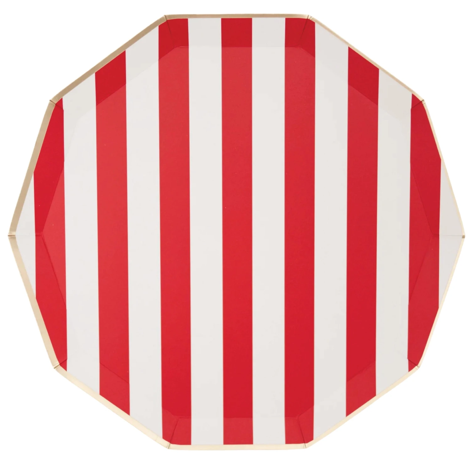 Experience an instant vacation and turn up the heat with these Cherry Red Cabana Striped Dinner Plates! These large paper plates are crafted from eco-conscious materials and feature a decagonal shape with a stylish red and white wide stripe design. Perfect for serving up your favorite foods and snacks while keeping cleanup easy, these disposable plates are a must-have for any celebration. Plus, their vibrant red stripes make them a versatile option for any party theme. Whether for birthday parties, baby showers, or holiday gatherings, these striped red plates ensure your tableware is as festive as your occasion!