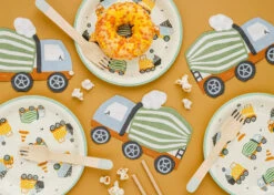 Mix it up and clean up messes at your construction party with these Construction Vehicle Dessert Napkins! These paper napkins look like a concrete mixer construction vehicle with a green mixer and blue truck. Set a stack of these construction napkins on the dessert table or place one at each table setting so guests can wipe up small spills. Your guests will dig these party napkins when you use them at your child’s construction birthday or an under-construction baby shower.