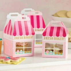 Hand out delicious treats at your baking party with Bakery Treat Boxes. These cupcake boxes are easily assembled to resemble a bakery shop window with cupcakes and cookies and a pink striped awning that reads “Fresh Baked” on top. The convenient folding design and carrying handle make them the ideal take-home gift boxes for any cupcake party. Fill these favor containers with cupcakes, cookies, or other treats and hand them out as party favors at your sweet little one’s birthday or ice cream party.Â
