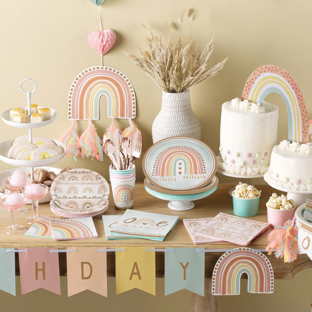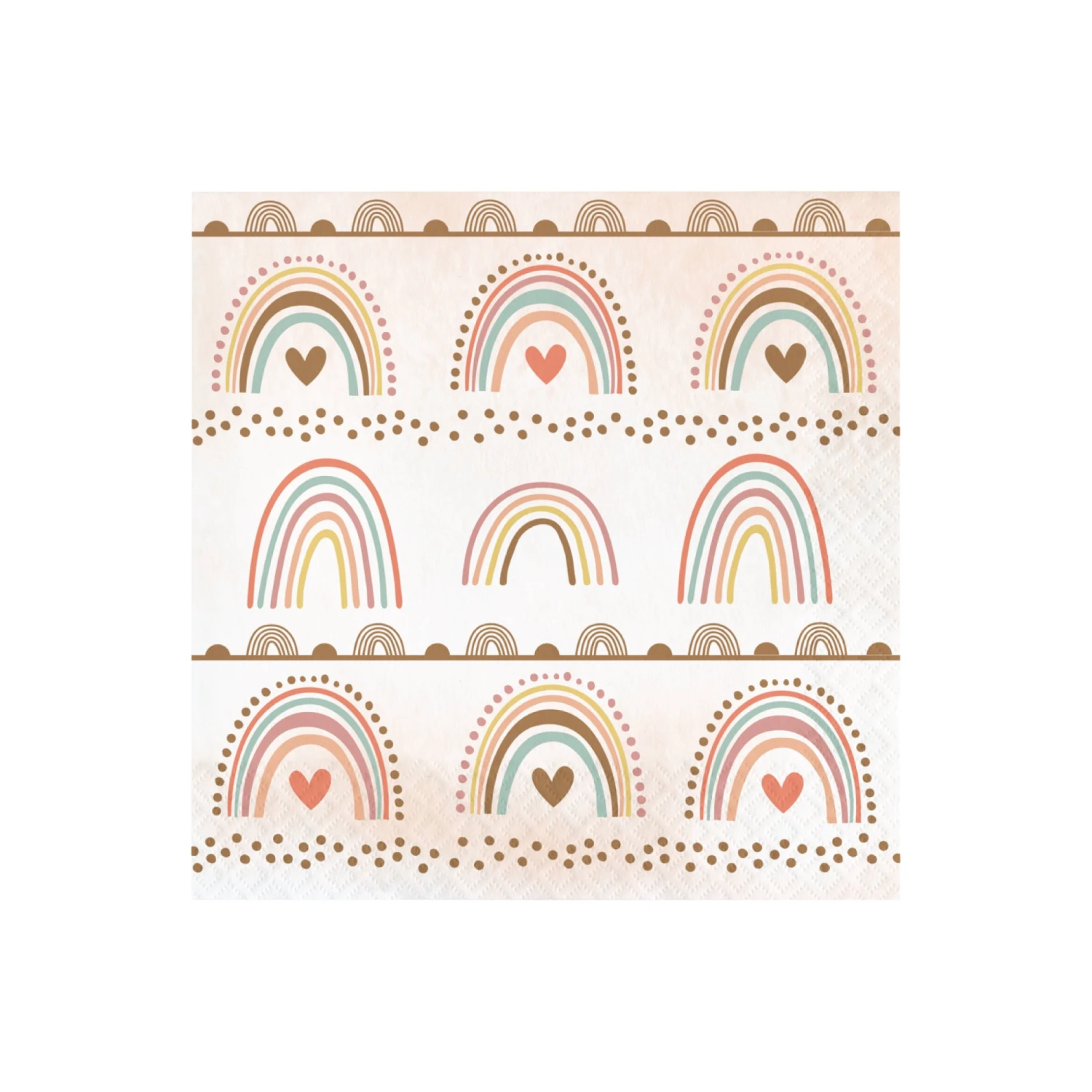 Set a lovely, bohemian table for their celebration with these Boho Rainbow Lunch Napkins. These large napkins feature a pastel rainbow pattern with polka dots and copper accents on a pale orange background. Not only will these boho napkins protect your tables, but they will also create a stunning foundation for your boho baby shower or little one’s boho rainbow birthday party.Â