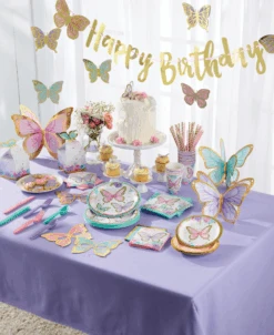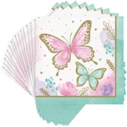 Keep small hands clean at their butterfly birthday party with Butterfly Lunch Napkins! These large paper napkins feature purple, blue, and gold butterflies with a watercolor blooms background and a teal border around the edge. Guests will be ready to flutter on over to their seats when you set one of these two-ply paper napkins on each place setting at your child’s butterfly birthday party. Perfect for serving with lunch and making party cleanup a breeze at a littler butterfly baby shower.