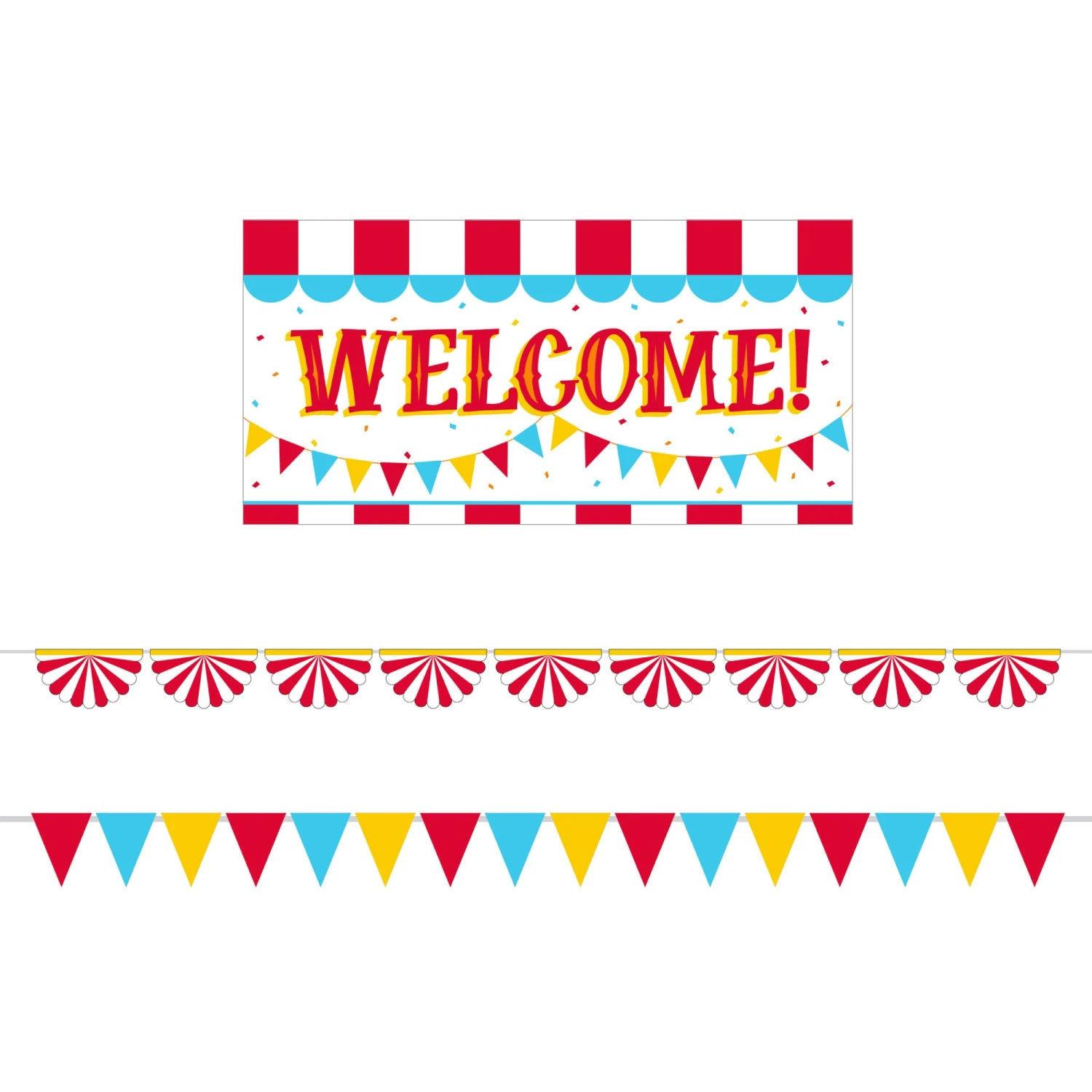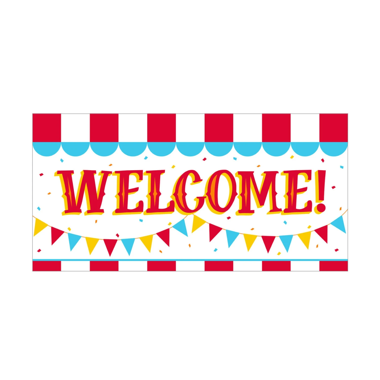 Welcome your family and friends to the Greatest Show on Earth with these Carnival Welcome Sign & Banners Set. This set includes a bright-colored WELCOME sign, red and white bunting banner, and a red, blue, and yellow pennant banner. Hang these signs to create a warm welcome to your guests. These signs are perfect decorations for a circus, county fair, or carnival party.