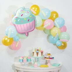 A Cupcake Party Balloon Garland Kit is a fun and creative way to make your child’s cupcake birthday party a sweet one. This balloon garland kit comes with pastel latex balloons in mint green, pink, light blue, and yellow with a cupcake mylar balloon. Mix up excitement for a “bun in the oven” baby shower or your little chef’s baking party with this balloon garland kit.