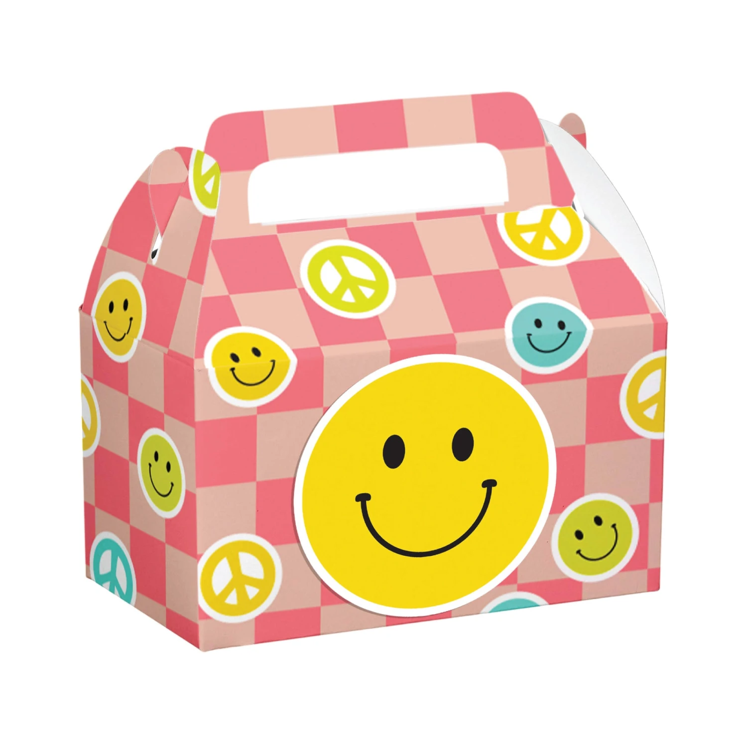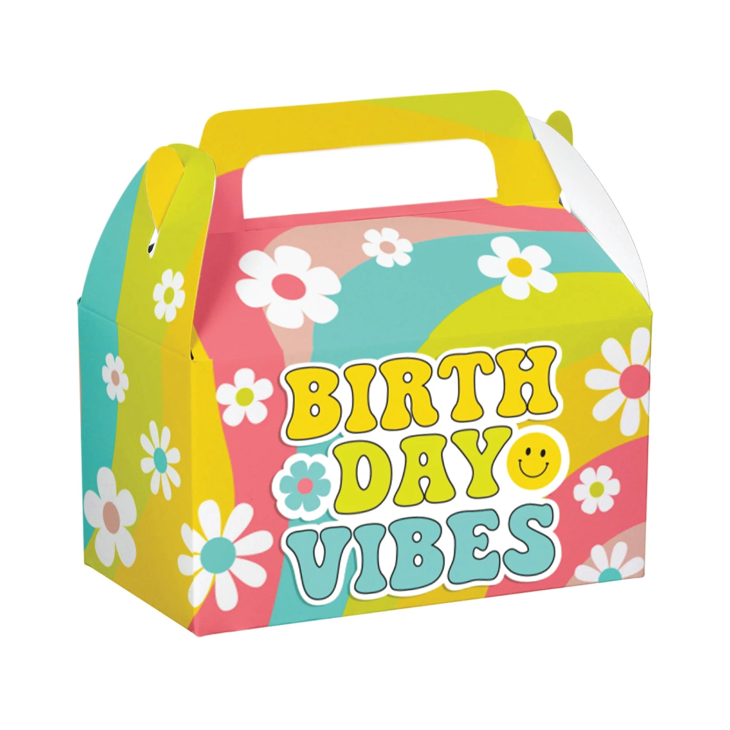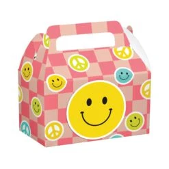 Whether you are throwing a retro–themed party or just looking for a unique way to thank your guests, these Flower Power Favor Boxes will surely be a hit. The boxes feature a groovy, mod design that will add a touch of style to any table. Two designs are included, one featuring colorful smiley faces and peace signs on a pink checkered background, and the other has a bright swirl pattern in yellow, lime green, aqua blue, and pink with daisy flowers and the words Birthday Vibes in a retro font. In addition, the convenient folding design and carrying handle make them the ideal take-home gift boxes. With these treat boxes, you can make your guests feel special and thank them for being a part of your special day. Fill these favor containers with cupcakes, cookies, or other treats, and hand them out as party favors at your child’s groovy birthday or daisy party.