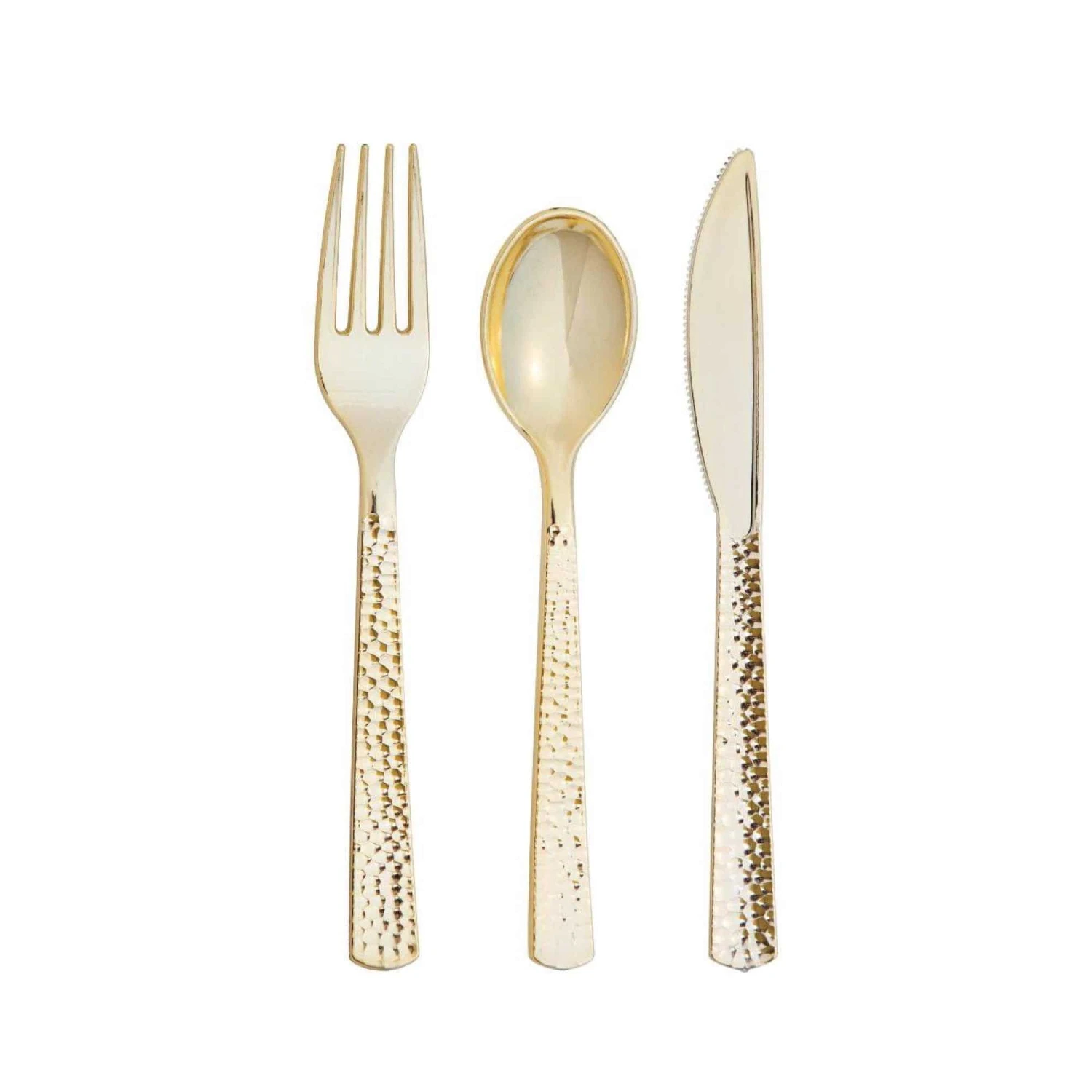 Give your guests a premium dining experience when you use this Gold Premium Plastic Hammered Cutlery Set. This set includes plastic forks, knives, and spoons for a party of eight. All pieces are made of durable plastic and feature hammered handles in a shining metallic finish. Use gold plastic cutlery for birthdays, holidays, or other gold-themed celebrations!