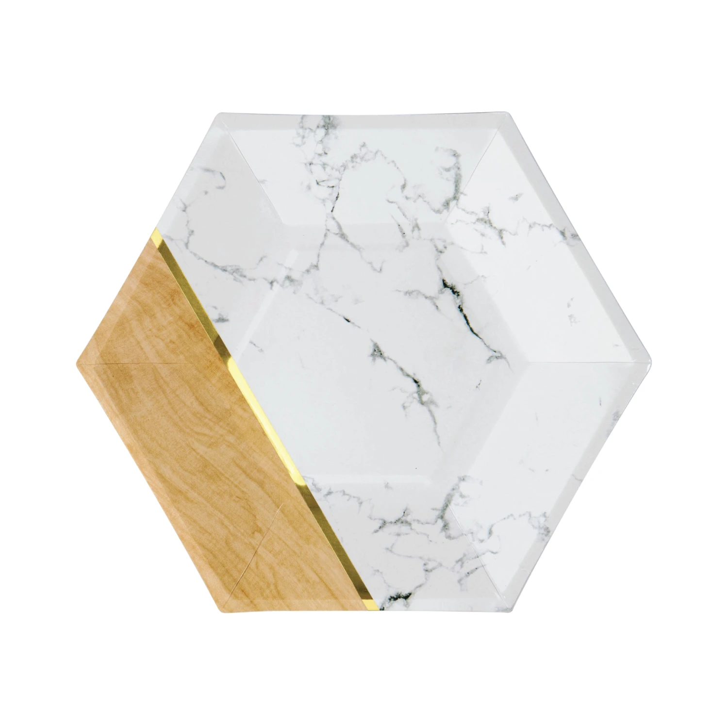 Enjoy a delicious piece of cake on these White Marble & Faux Wood Hexagon Dessert Plates! These small marble hexagon paper plates feature a shiny gold foil line with white marble and faux wood halves. They look great as part of a table setting and work well with various birthdays, weddings, holidays, and elegant social gatherings. Create a bold and memorable tablescape by pairing these plates with other trendy party supplies!