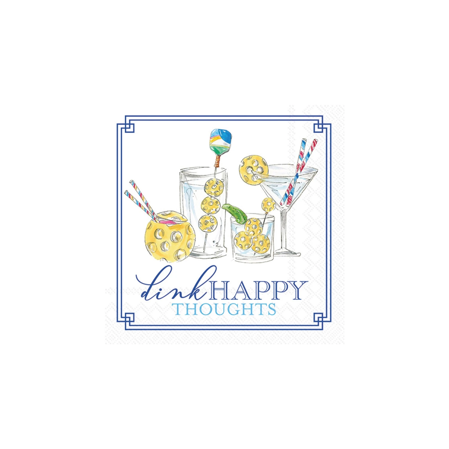 Sip, dink, and celebrate the good times with Pickleball Served All Day Dessert Napkins! These small paper napkins are the perfect match for your next outdoor gathering, boasting four pickleball-themed cocktail drinks and a cheerful blue “dink happy thoughts” headline. Whether using them as playful drink coasters during intense rallies or as handy cleanup companions for small spills, these cocktail napkins are a smash hit at any pickleball party or tournament.Â