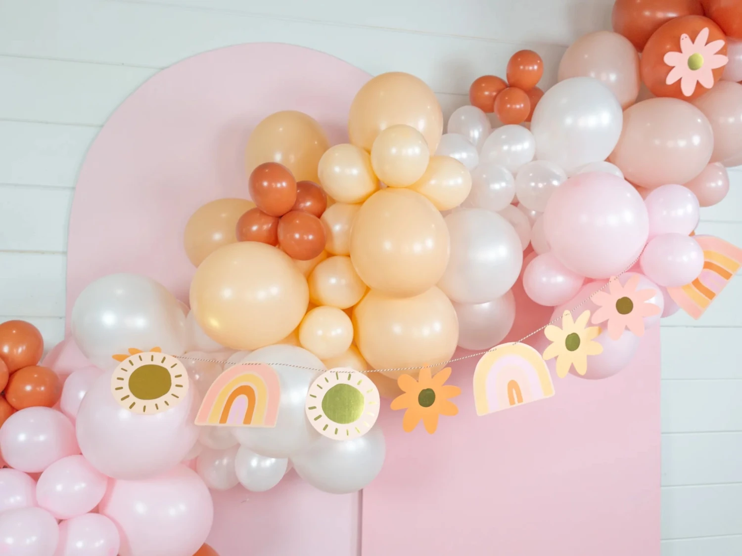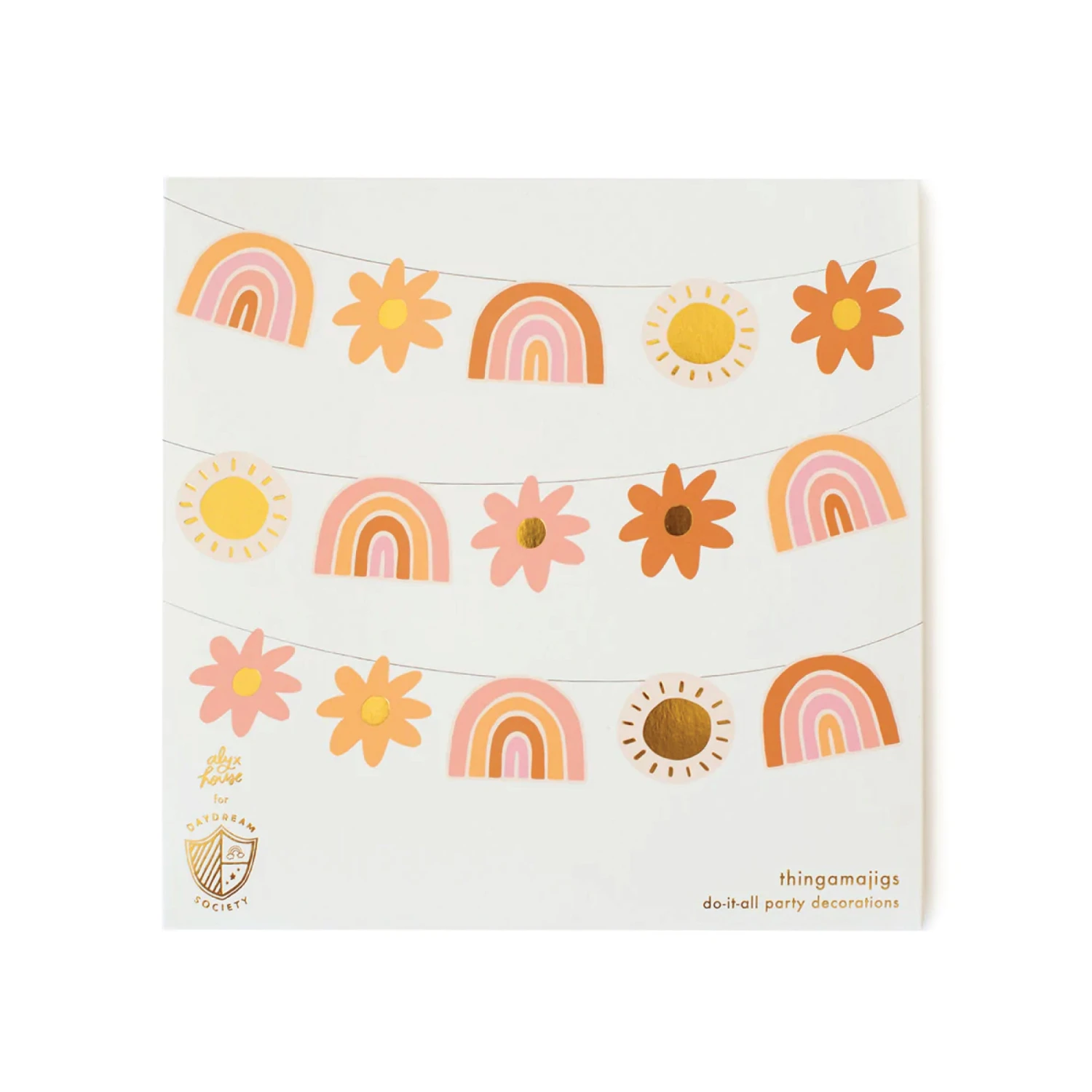 Create a groovy scene for a boho birthday party by decorating with this Retro Rainbow Party Garland! This DIY garland comes with 16 cutouts of boho-colored rainbows, daisies, gold foil sun, and twenty feet of twine. Use the included twine to string them together to make a garland, or hang them on walls for a photo booth backdrop. Hang this garland or use the cutouts for table decor to display a ray of colors at a groovy birthday party, hippie party, or your rainbow baby shower.Â