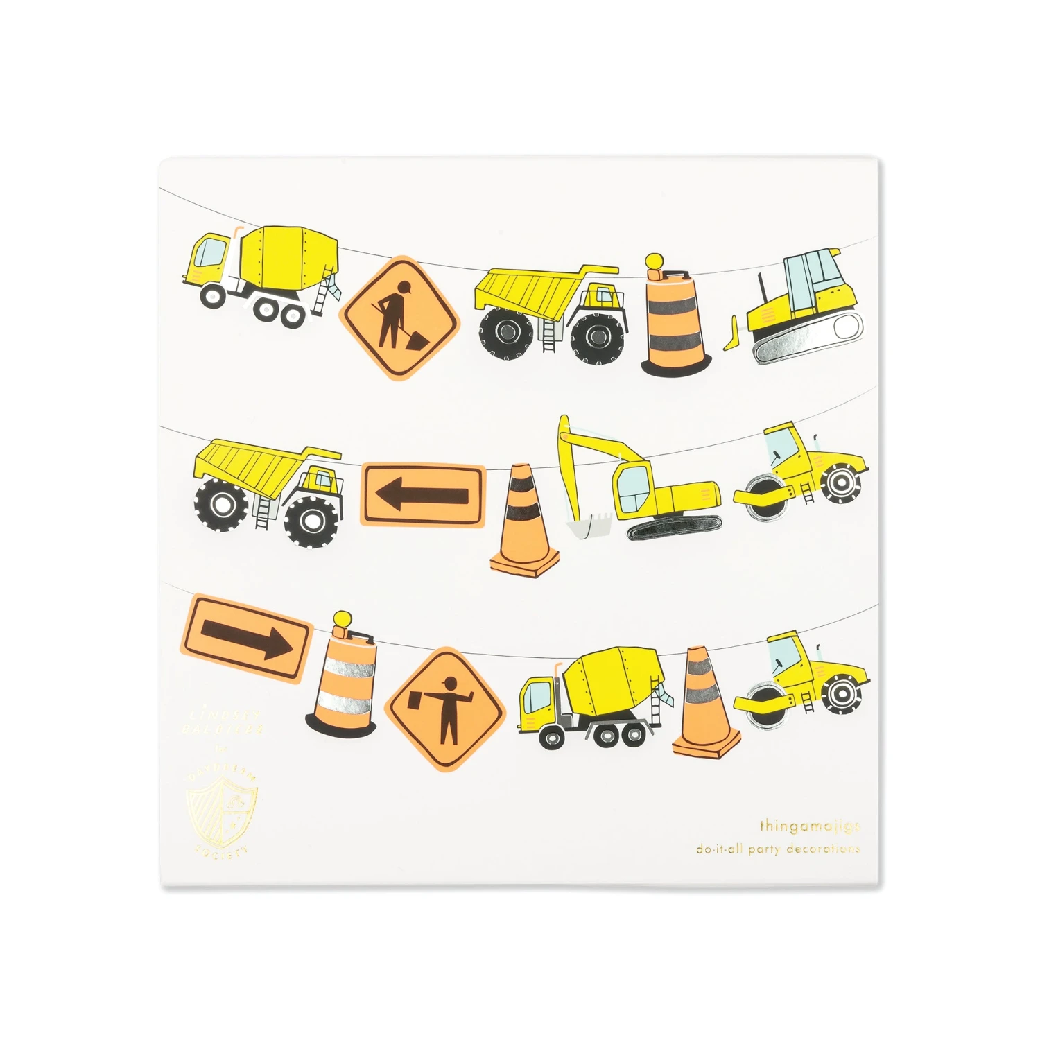 Decorate for your little one’s construction-themed birthday party with this Under Construction Garland! This DIY garland features yellow dump trucks, orange construction signs, and traffic cone cutouts with silver foil elements. Use the included twine to string them together to make a garland, or hang them on walls for a photo booth backdrop. Guests will know they’ve entered the party zone when use decorate your under-construction baby shower with this garland!