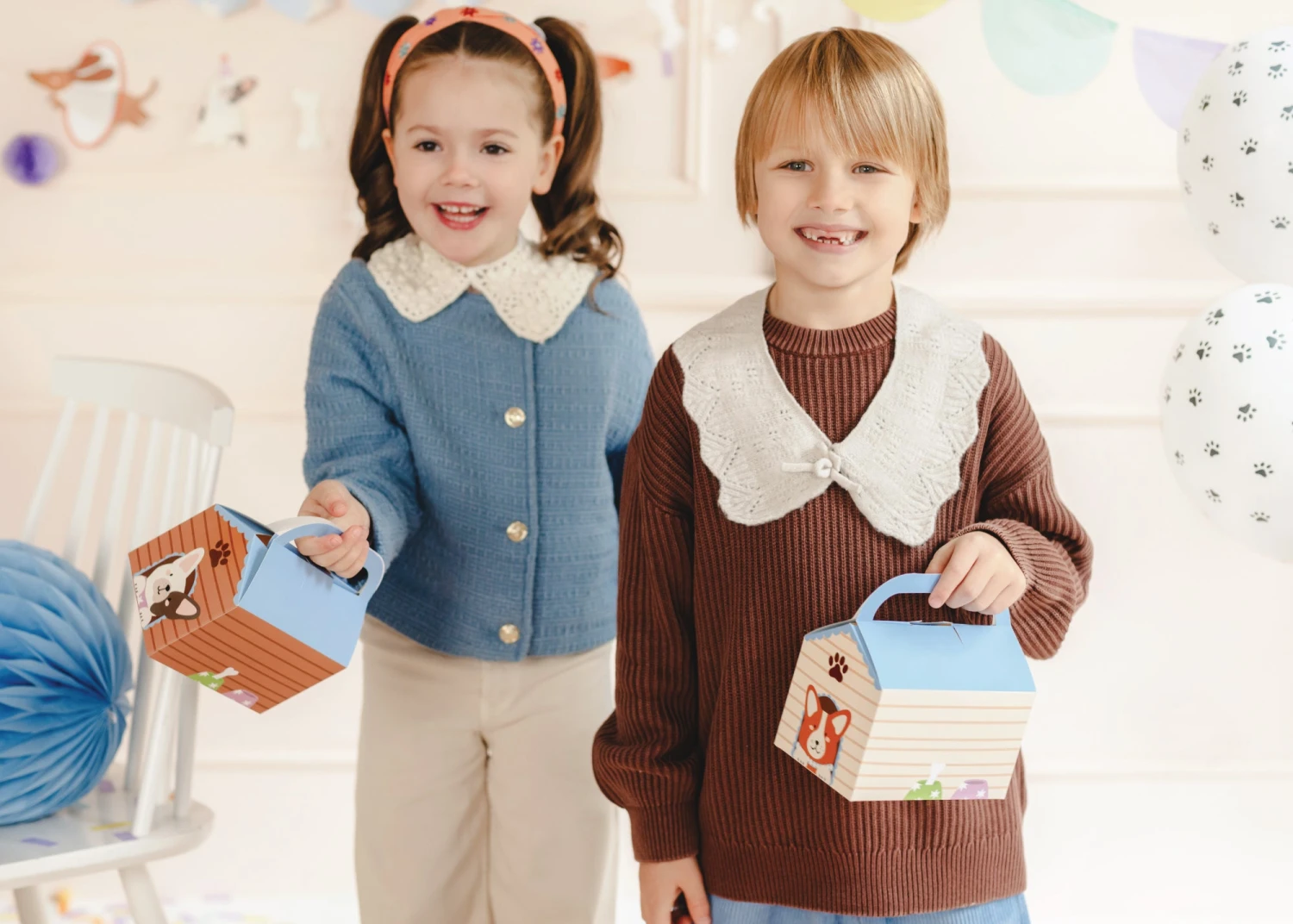 Give your dog party treats a cozy home with these Doghouse Treat Boxes! These paper favor boxes come in two fun designs: a brown doghouse with a bulldog and a tan doghouse with a corgi, each featuring a striped pattern and a blue roof that doubles as a handle for easy carrying. Perfect for filling with candy, toys, or desserts, they’re also ideal for holding a plush puppy at an adopt-a-puppy party. Use these dog favor boxes for your little pup’s let’s pawty birthday or any canine celebration to make tails wag!