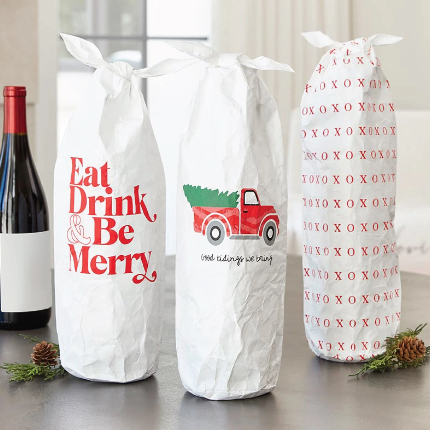 Bring the hostess the perfect gift of your favorite bottle of wine with this Eat, Drink, & Be Merry Tyvek Wine Bottle Bag. This Tyvek wine bag features the headline “Eat, Drink, & Be Merry” in red on a white background. This wine bag ties together at the top to hold the perfect bottle. Give an intoxicating gift for the hostess, a friend’s birthday, or to say thank you. Put a bottle of bubbly or wine in this gift bag for a quick and easy gift that’s sure to please.