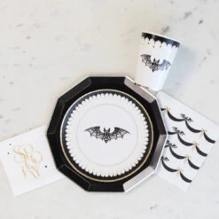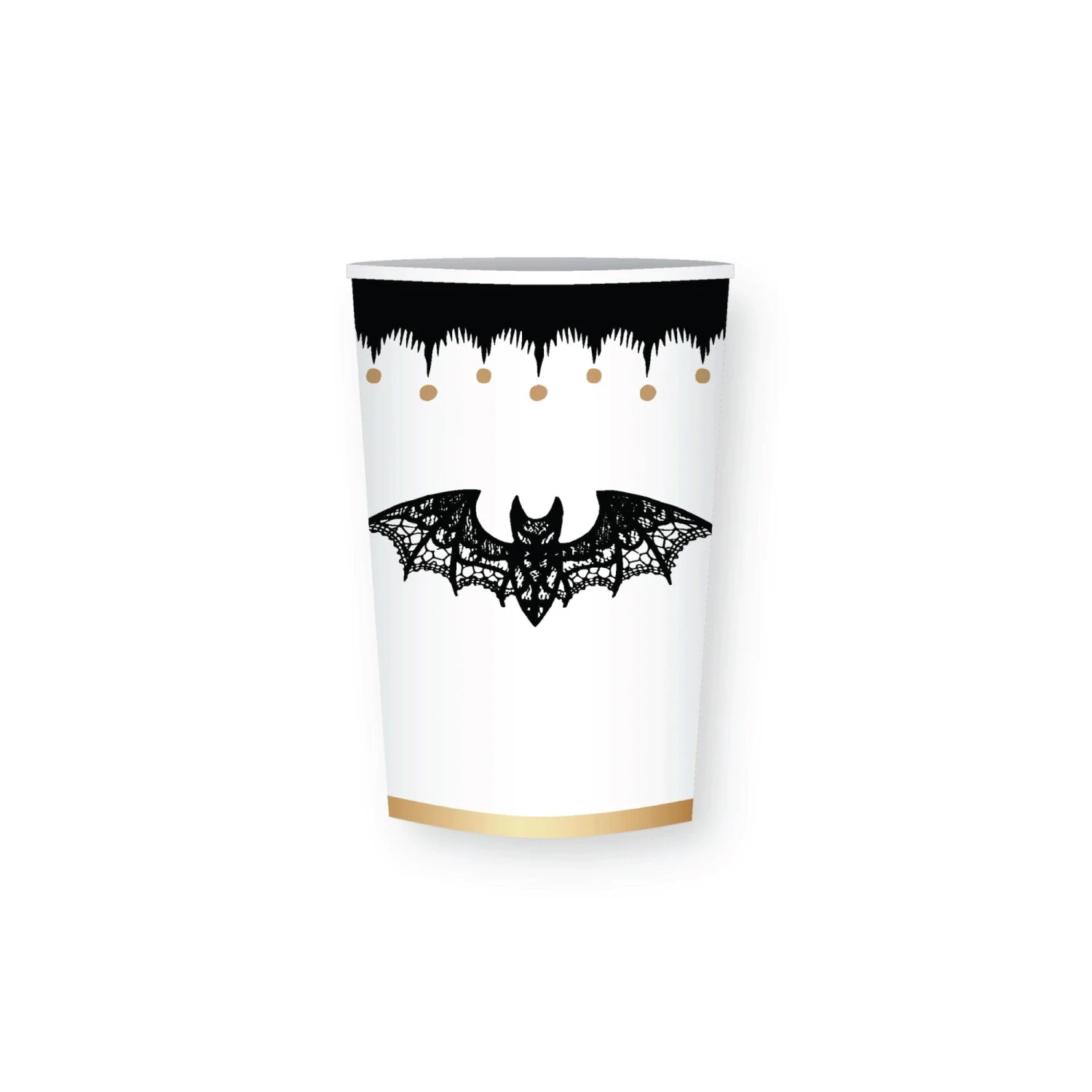 Don’t go batty—sip your favorite beverages at your Halloween party with these Elegant Halloween Paper Cups! These paper cups feature a scary chic design with a delicate lacy bat on a white background, framed by a gold foil border along the bottom and an eerie black border along the top. Perfect for sipping hot or cold beverages, these disposable cups make cleanup a breeze. Use these Halloween cups at a spooktacular party for kids or adults, adding elegance to your eerie celebration.