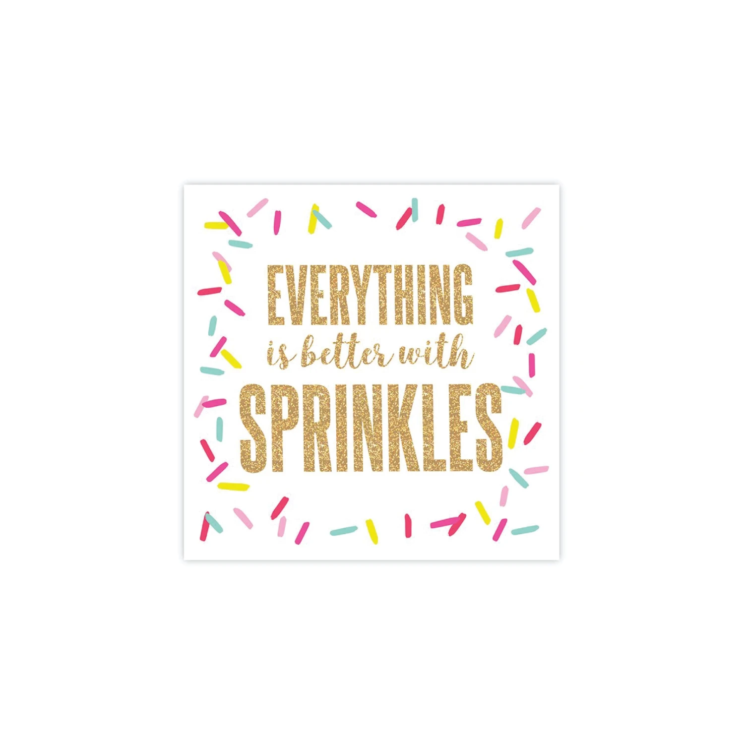 Brighten up your summer party with these ‘Everything is Better with Sprinkles’ Beverage Napkins. These small paper napkins feature bright pastel sprinkles on a white background and gold foil wording ‘Everything is better with Sprinkles’ in the center of the napkin. Use the fun napkins for a baby sprinkle or ice cream or donut-themed birthday party.Â