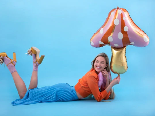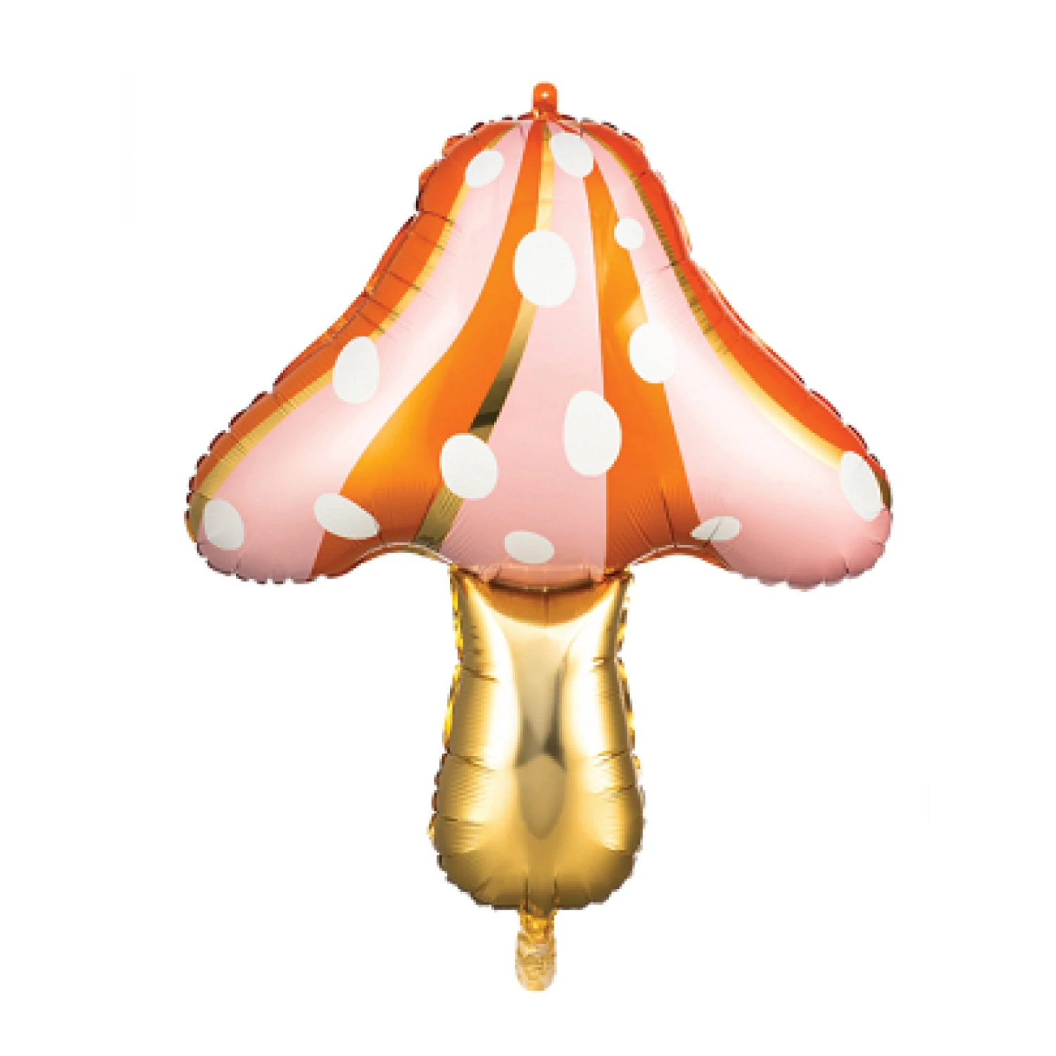 Add some magic from the forest floor with this Fairy Toadstool Foil Balloon! This sensational balloon is shaped like a mushroom with white dots on light pink, orange and gold striped background and a gold stalk. Inflate this party balloon with air or helium, tie it to a chair, or use it in a photo booth backdrop. Match this toadstool balloon with the rest of your fairy garden table decorations for your child’s enchanted forest birthday party.