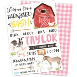 Everybody will be excited for your little one’s farm-themed birthday party when they receive this Farm Birthday Party Invitation in the mail. This two-sided invitation features a red barn, friendly farm animals, a shovel and pitchfork and an optional pink and white or red and white checkered backside. Perfect for your little farmer’s barnyard birthday bash, this listing is for a personalized digital invitation that is print-ready. It’s easy to customize your message. If you would like to request different colors, please contact us for a custom order. With our fast production schedule, we will have these in no time!