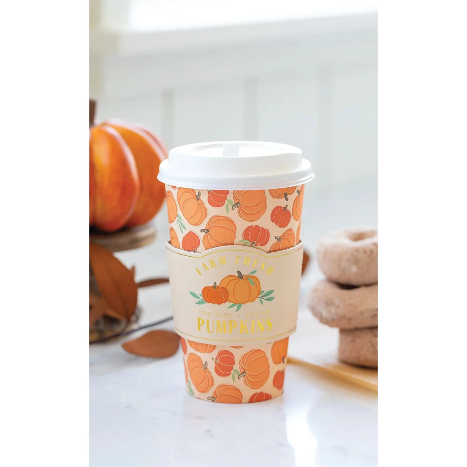 Enjoy a cozy coffee with your friends using these Farm Fresh Pumpkins Coffee Cups. These disposable coffee cups feature a scattered pattern of orange pumpkins with gold foil details on a pale orange background, a white lid, and a peach sleeve with pumpkins and a “Farm Fresh Pumpkins” headline in gold foil. Whether you want the perfect cup to display on your hot cocoa bar, a pretty cup for your guests to carry, or you just want to enjoy a warm cup of coffee in your kitchen, this set of 8 coffee cups is the perfect way to celebrate the fall holidays. Make these fun cups a unique gift for a teacher, friend or family when you pair them up with hot cocoa mix, seasonal tea bags, or pumpkin spice coffee!