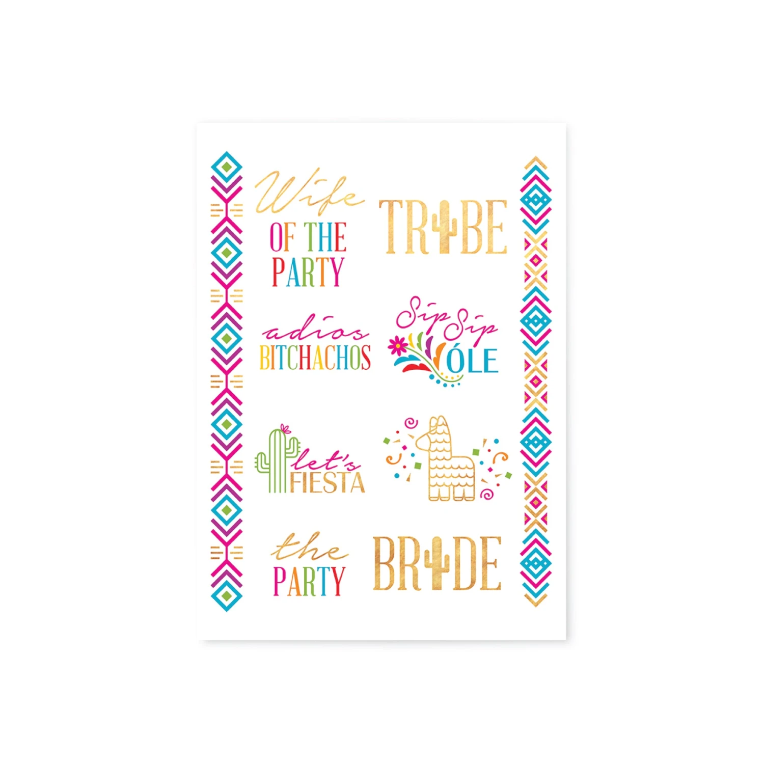 Shine bright with the nacho average bride wearing Final Fiesta Bachelorette Temporary Tattoos. These body art tattoos feature shimmering gold and multicolored sayings like “Sip Sip Ole,” “Let’s Fiesta,” and “Adios Bitchachos” with a cactus, llama, and tribal design. Apply these fiesta tattoos to your face, hands, arms, or any place you see fit. These bridal shower tattoos are excellent bachelorette party favors. So hand them out to your bridesmaids to wear at your fiesta bachelorette party!Â