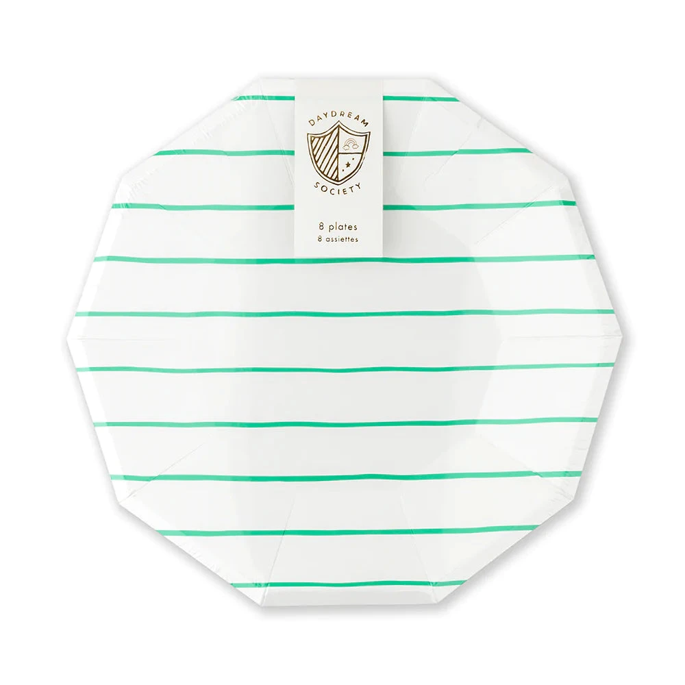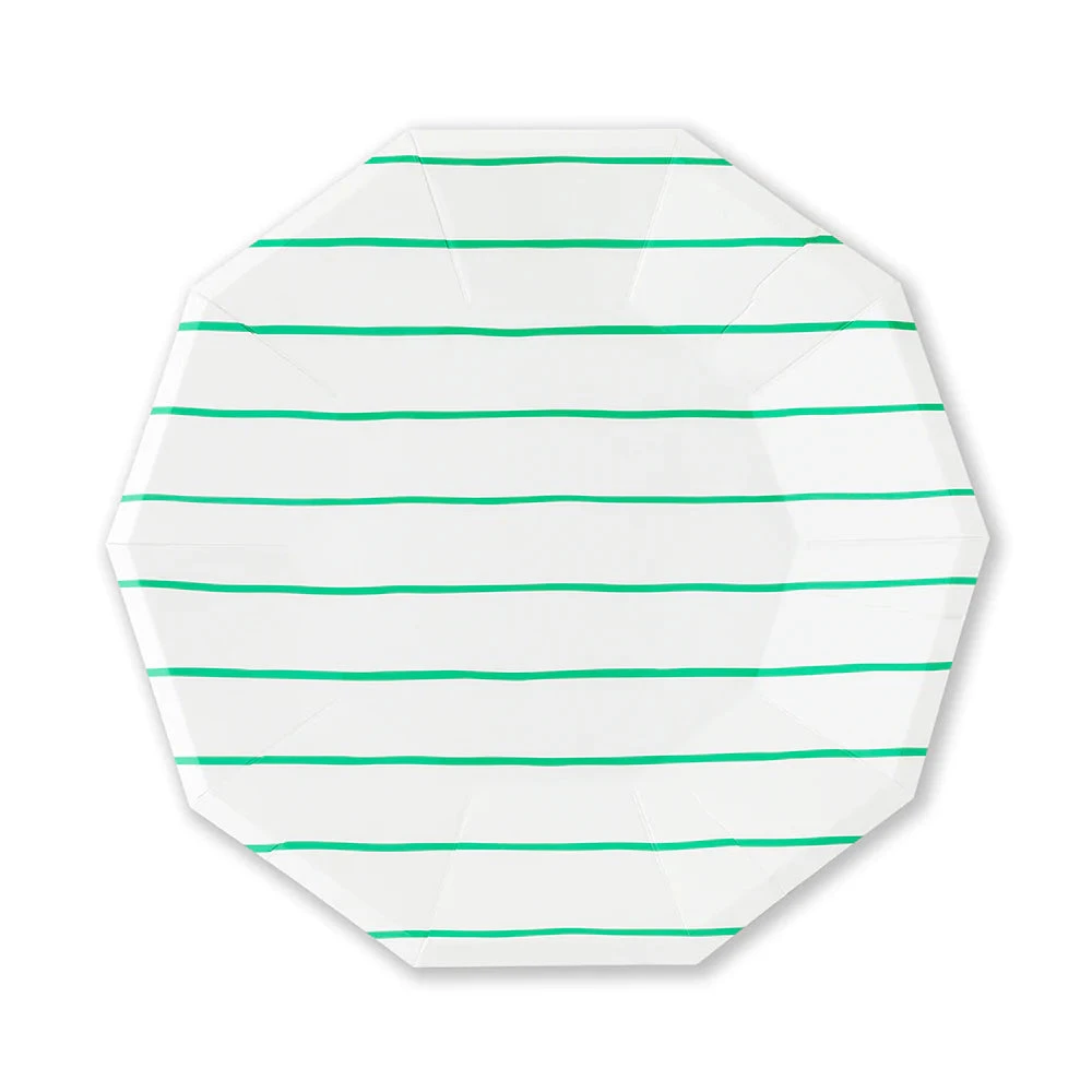 Use these simple yet oh-so-cute Frenchie Green Striped Lunch Plates to create a base layer for your next party. These paper plates feature a decagon shape with thin green stripes inspired by the iconic French Breton stripe. Set a stack of these plates on the buffet table so guests can help themselves to delicious party food. This party plate’s festive green lines are perfect for coordinating with your event theme, including baby showers, birthdays, holidays, and more.