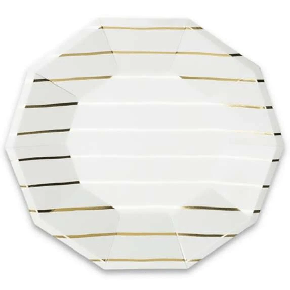 These elegant Frenchie Metallic Gold Striped Lunch Plates are inspired by the iconic French Breton stripe. These white decagon-shaped paper plates with gold-foiled stripes are anything but basic. Let them stand alone or mix and match with another pattern to create your own look!