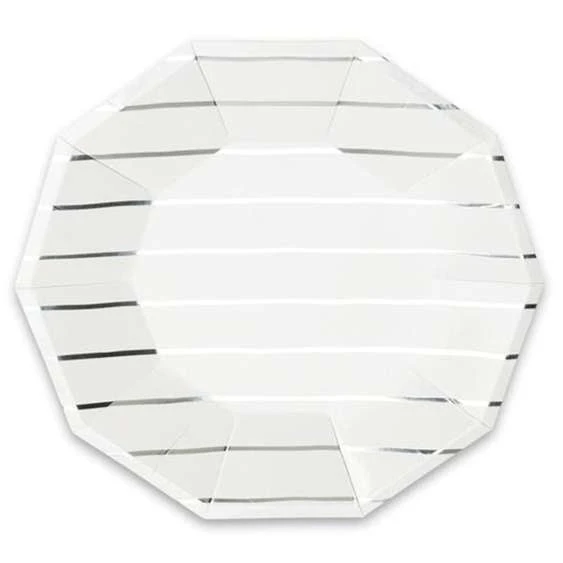 Set the table in style with these Frenchie Metallic Silver Striped Lunch Plates, inspired by the iconic French Breton stripe. The white decagon-shaped paper plates with silver-foil stripes are anything but basic. Let them stand-alone or mix and match with another pattern to create your own look!