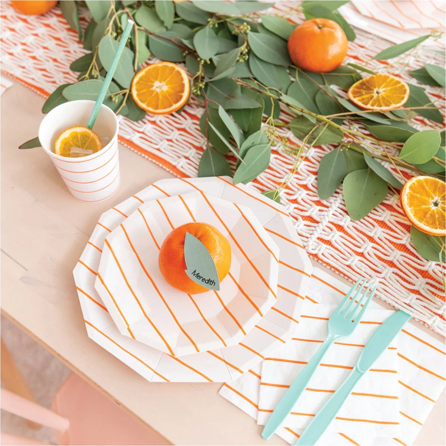 Enjoy your party drinks in style with these Frenchie Orange Striped Cups! These cups feature an orange-striped pattern inspired by the iconic French Breton style on a white background. Let them stand alone or mix and match with another pattern to create your own look! These cups are perfect for any type of celebration.