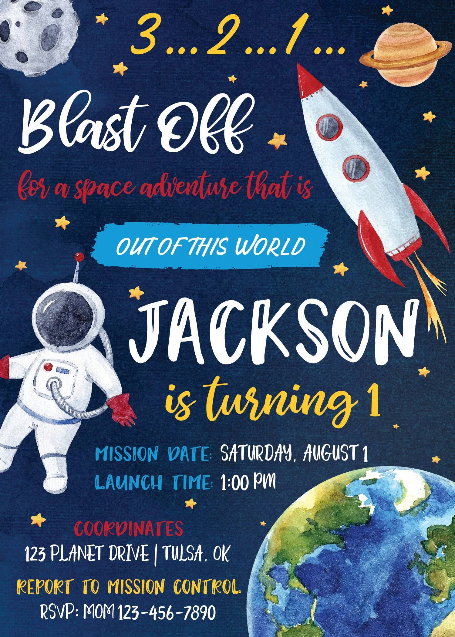 Launch your party invites with this Galaxy Space Birthday Party Invitation. Featuring a rocket ship, stars, and a friendly astronaut, this outer space party invitation is perfect for your child’s first birthday party or any age birthday! This listing is for a personalized digital invitation that is print-ready. It’s easy to customize your message. If you would like to request different colors, please contact us for a custom order. With our fast production schedule, we will have these in no time!