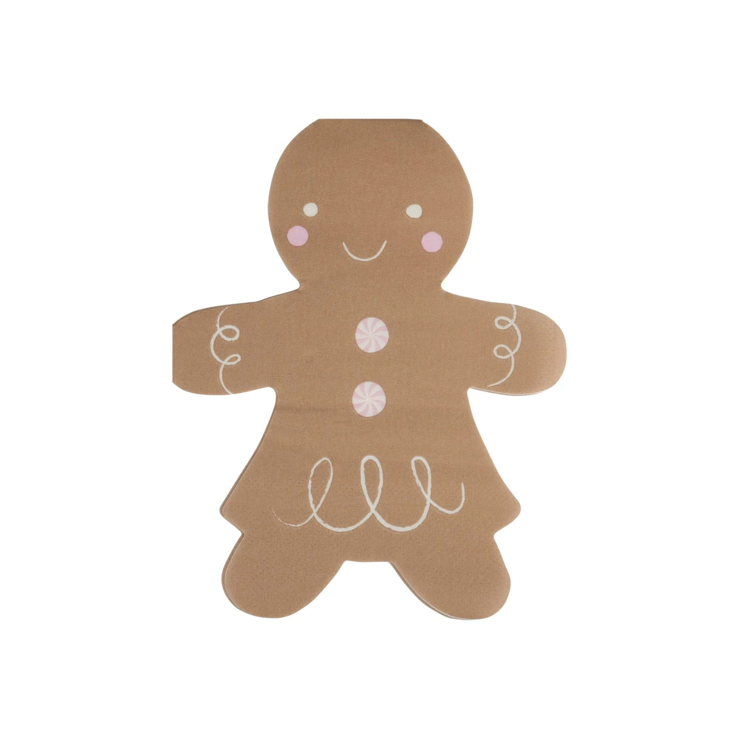 Spice up your holiday fun with these Gingerbread Girl Dessert Napkins! These brown paper napkins are shaped like a gingerbread girl wearing a dress, with frosted swirls and pink peppermint summarys. Perfect for serving with your favorite holiday treats or keeping hands clean while building gingerbread houses. Use these Christmas napkins at your gingerbread house decorating party for sweet seasonal fun!