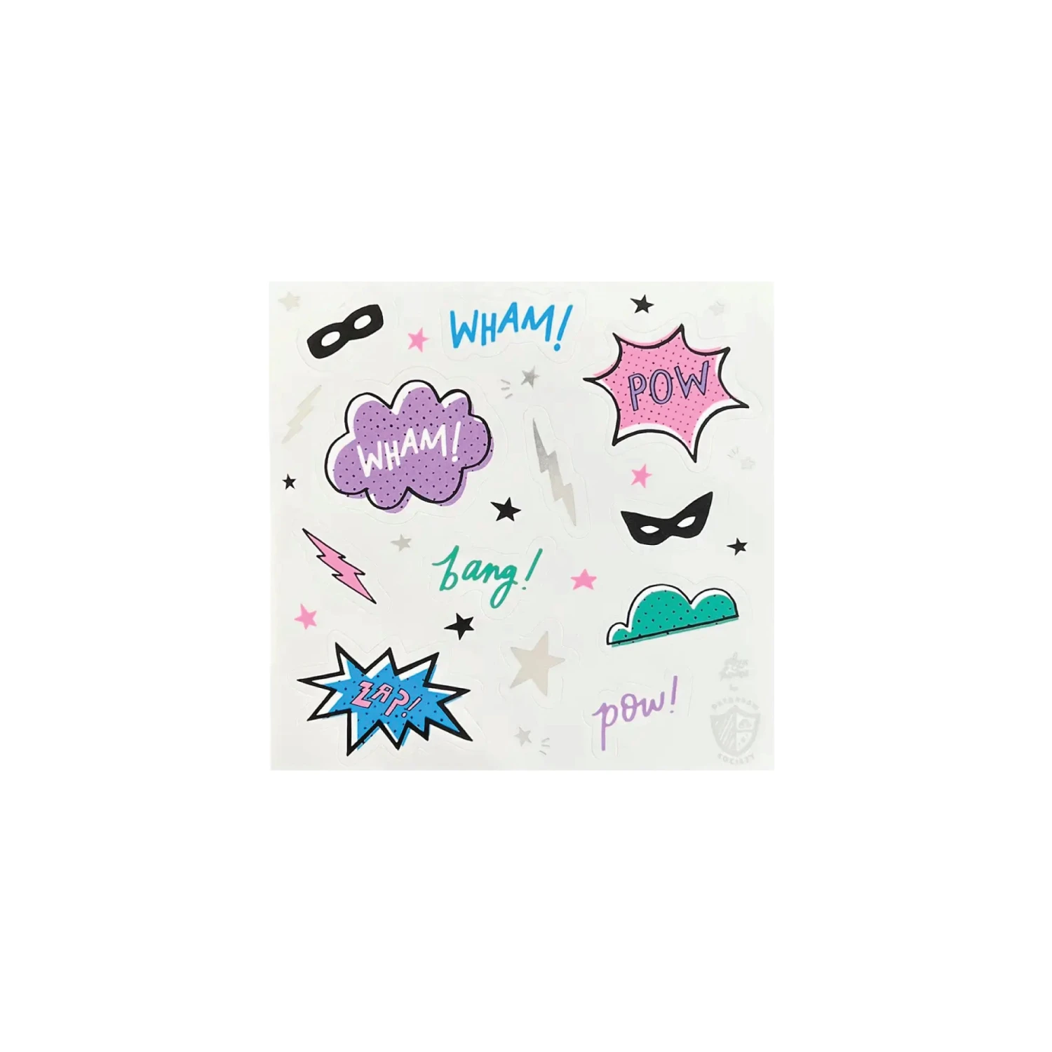 Unleash the fierce and fearless superhero within with these Girl Superhero Sticker Sheets! These four action-packed sheets feature 12 stickers, including black eye masks, comic sounds in shades of pink, blue, and purple clouds, and pink and silver foil lightning bolts. Perfect for adding an extra punch to invitations or as thrilling party favors at your child’s superhero birthday bash, these stickers will empower and inspire every little hero in attendance!