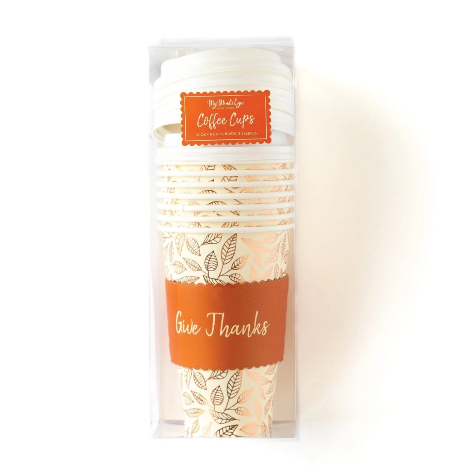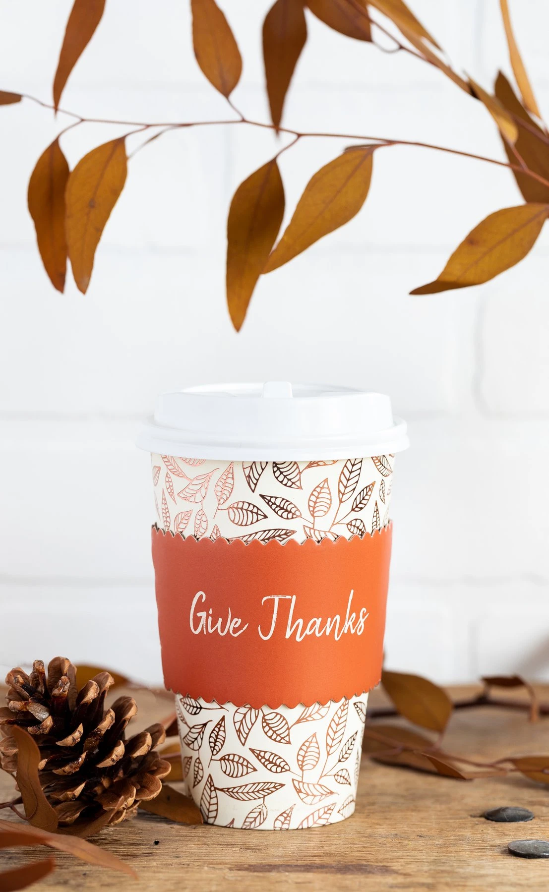Enjoy a fancy cup of coffee with your friends using these Give Thanks Coffee Cups. These disposable coffee cups feature dark gold foil leaves with a orange “Give Thanks” sleeve. Whether you want the perfect cup to display on your hot cocoa bar, a pretty cup for your guests to carry, or you just want to enjoy a warm cup of coffee in your kitchen, this set of 8 coffee cups are the perfect way to celebrate this Thanksgiving. Make these fun cups a unique gift for a teacher, friend or family when you pair them up with hot cocoa mix, seasonal tea bags, or pumpkin spice coffee!