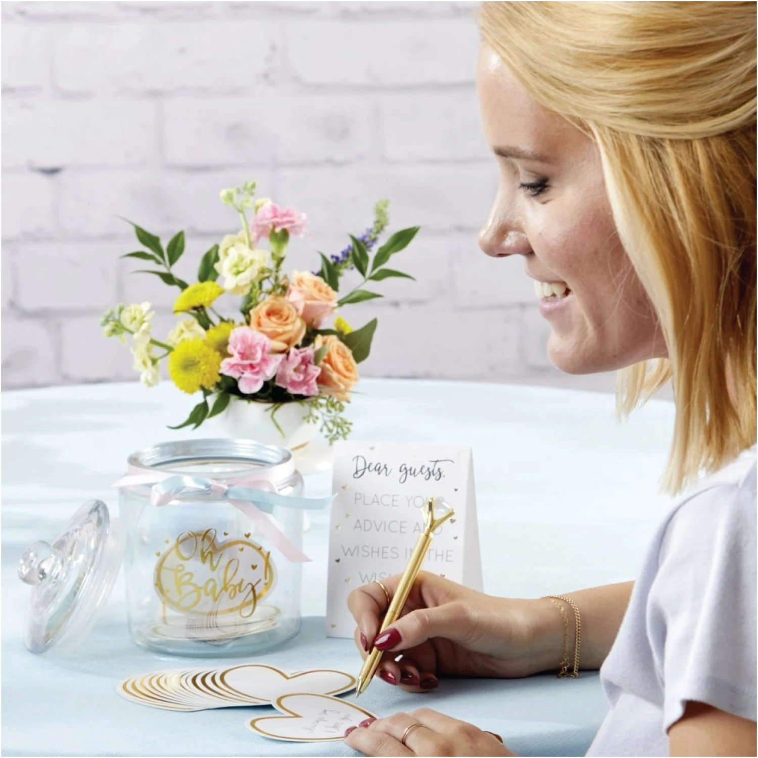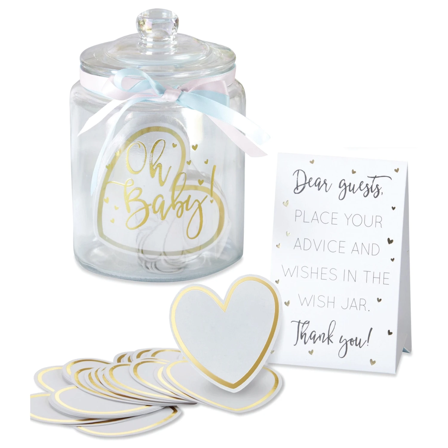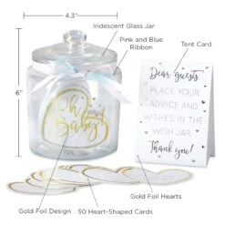Gather well wishes and advice for the mom-to-be with this Iridescent Glass Oh Baby Shower Wish Jar with Heart Advice Cards. This wishes for baby shower kit has an iridescent glass cookie jar that reads “Oh baby” in gold cursive font. Place the tent card next to the pot and heart-shaped cards at your baby shower event to instruct guests. Friends and family can use the included 50 advice cards to write sweet notes and place them in the wish jar as a memento of their special day. In addition, the glass jar can hold up to 500 heart-shaped cardstock cards for guests to sign. Additional Heart-Shaped Wishes & Advice Cards are also available in sets of 100.