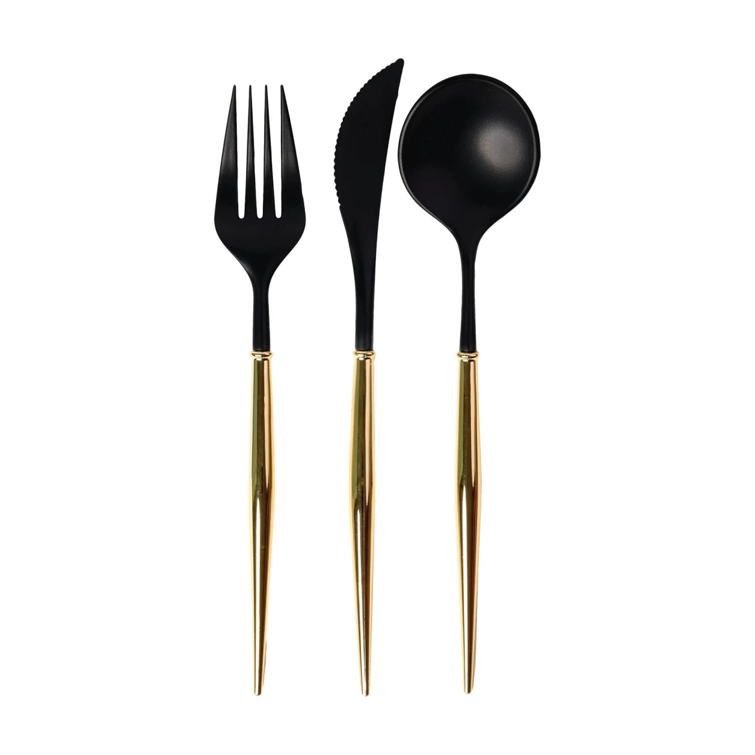 Create an elegant dining experience for your guests when you set the tables with this Black & Gold Plastic Cutlery Set! This plastic flatware set includes enough for a party of 8 to enjoy a three-course meal. Each utensil is made of food-safe plastic and has a shiny gold finish on the handles, and black fork, knife, and spoon ends. Set the table with reusable cutlery for birthdays, holidays, showers, weddings, or other special occasions, and wash them in the top-rack dishwasher for reuse!Â