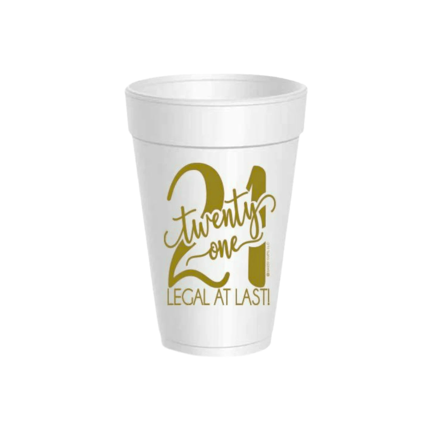 Celebrate your 21st birthday in style with these Gold Legal at Last Styrofoam Cups & Lids! These white styrofoam cups are adorned with a gold “21” number topped with a cursive “twenty-one” headline and a playful “legal at last!” message below. Perfect for serving hot and cold drinks, these shatterproof cups come with convenient plastic lids to help prevent spills and keep your celebration going strong. Whether you’re toasting with a mixed cocktail or refreshing beverage, these disposable cups are a must-have for any twenty-first birthday bash surrounded by all your legal friends!