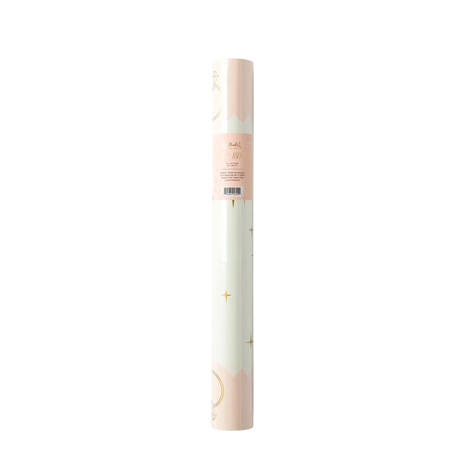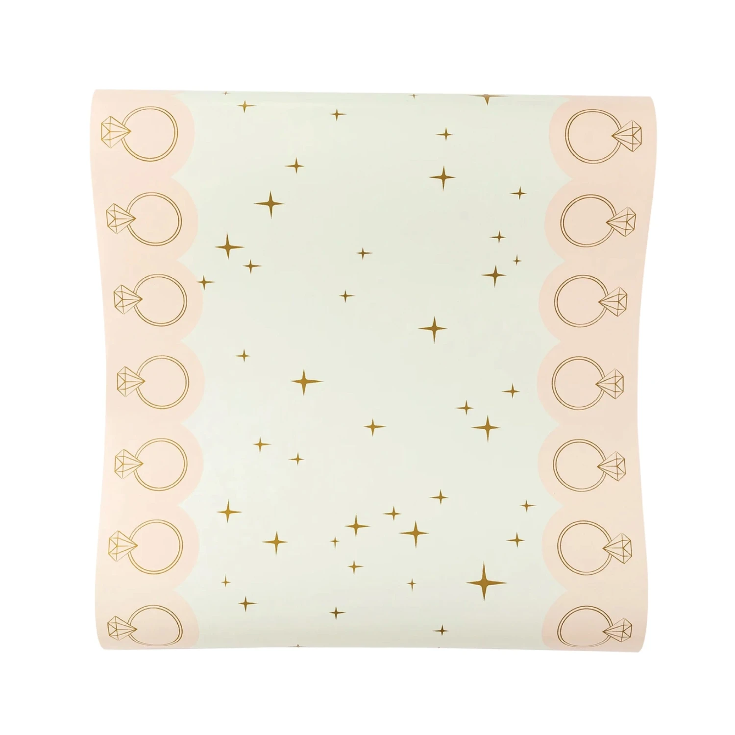 Make your bridal shower tablescape sparkle with this Gold & Pink Diamond Ring Paper Table Runner. This paper table decoration features shimmering gold stars on a cream background with light pink side panels with gold diamond rings. Use this disposable table runner at bachelorette parties, bridal showers, or engagement parties to make clean-up a breeze.